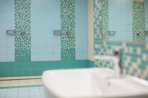 Osvěžení velkých ploch z obkládaček ColorOne a dlaždic ColorTwo zajistila ve sprchách zajímavá mozaiková dekorace, která připomíná déšť odrážející se na skle. Tady si obkladači doslova vyhráli. Mozaiky ze série ColorTwo si dle potřeby nastříhali, sestavili a znovu ručně lepili na síťky, tak aby jednotlivé kostičky vytvořily požadovaný motiv.