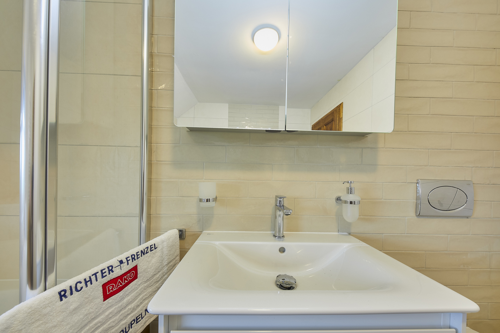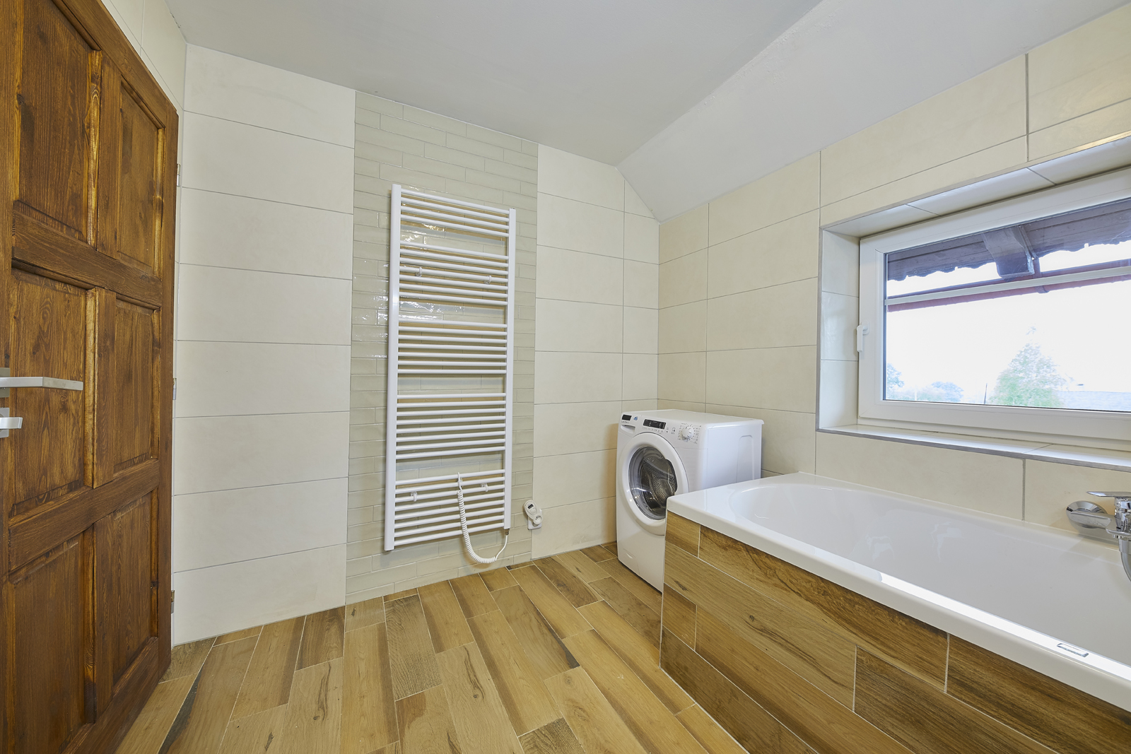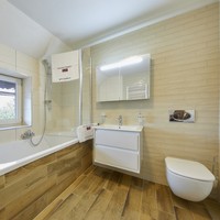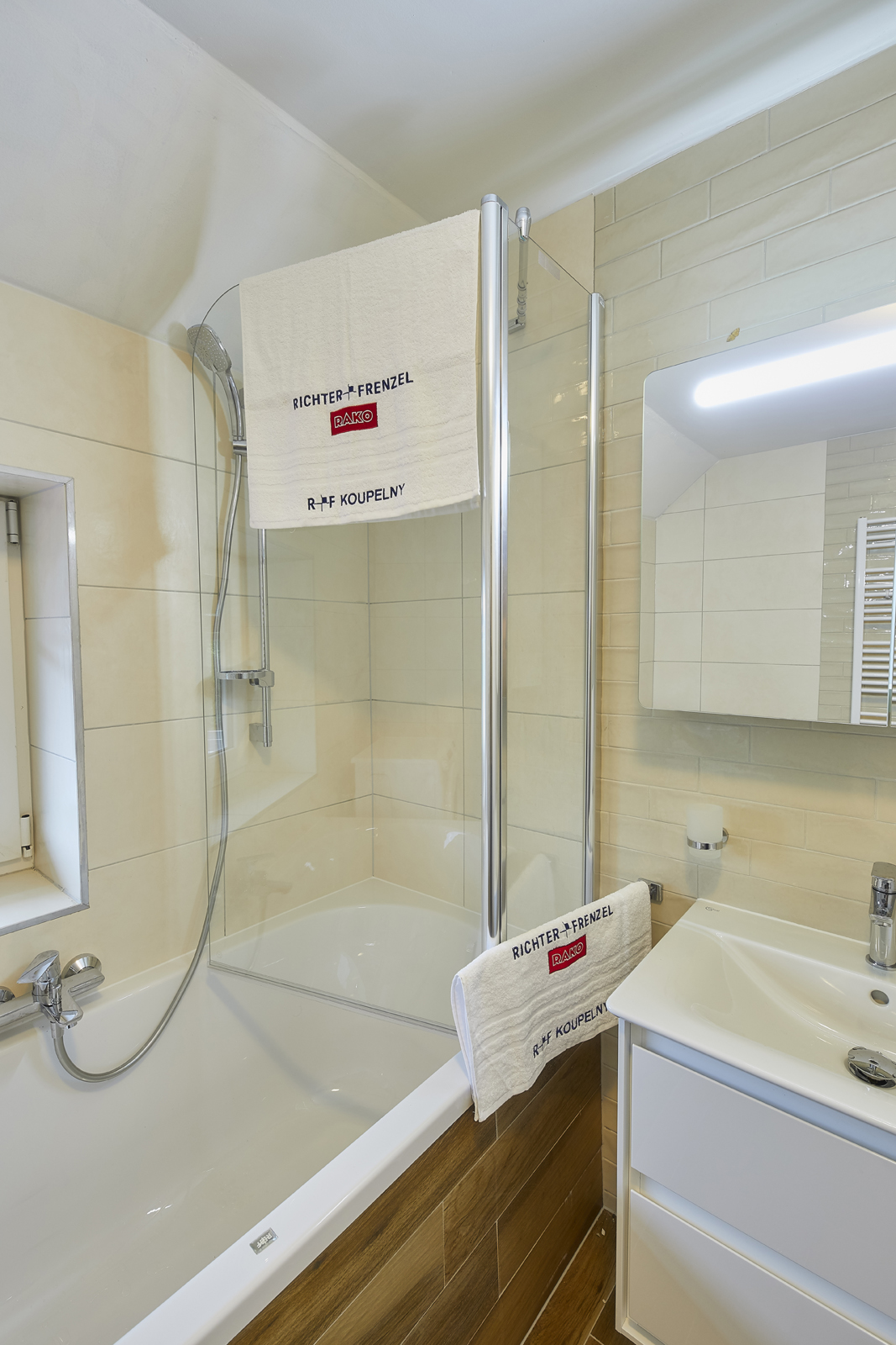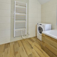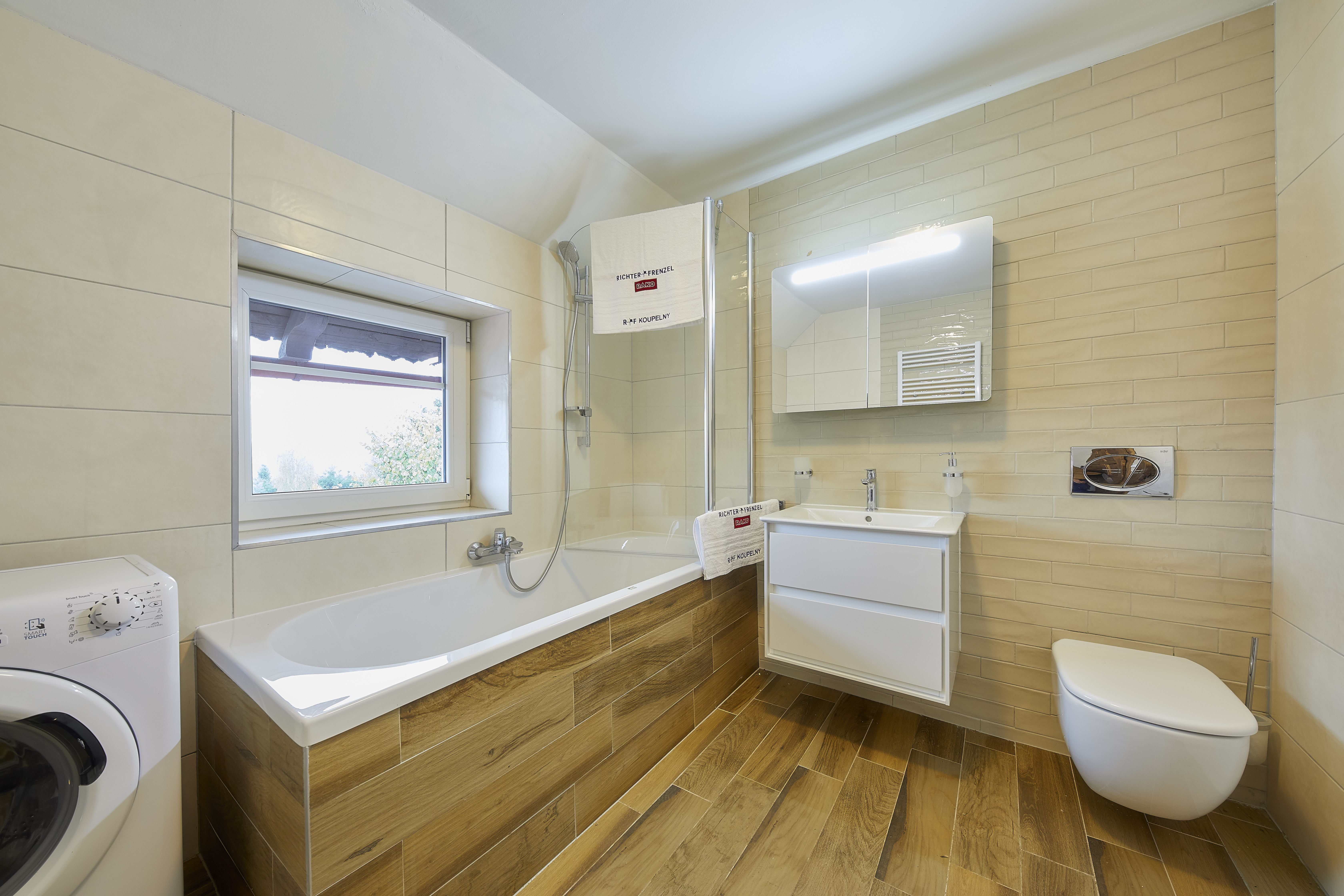 Obkládačky v koupelně jsou ze série Mano a na podlaze imitují dřevo keramické dlaždice Faro.