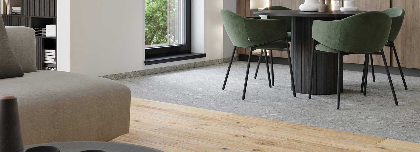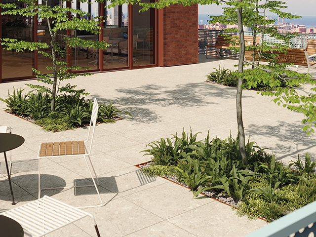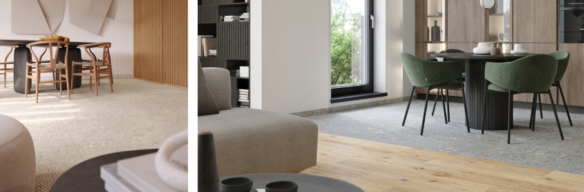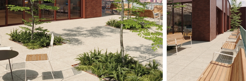 Komplexnost nabídky ocení návrhy, ve kterých se propojují interiérové dlaždice s venkovními dlaždicemi RAVE OUTDOOR s tloušťkou 2 cm. Ty jsou k dispozici ve formátu60 × 60 cm s hladkým povrchem, s protiskluzností R11/B, která je nezbytná pro venkovní použití.