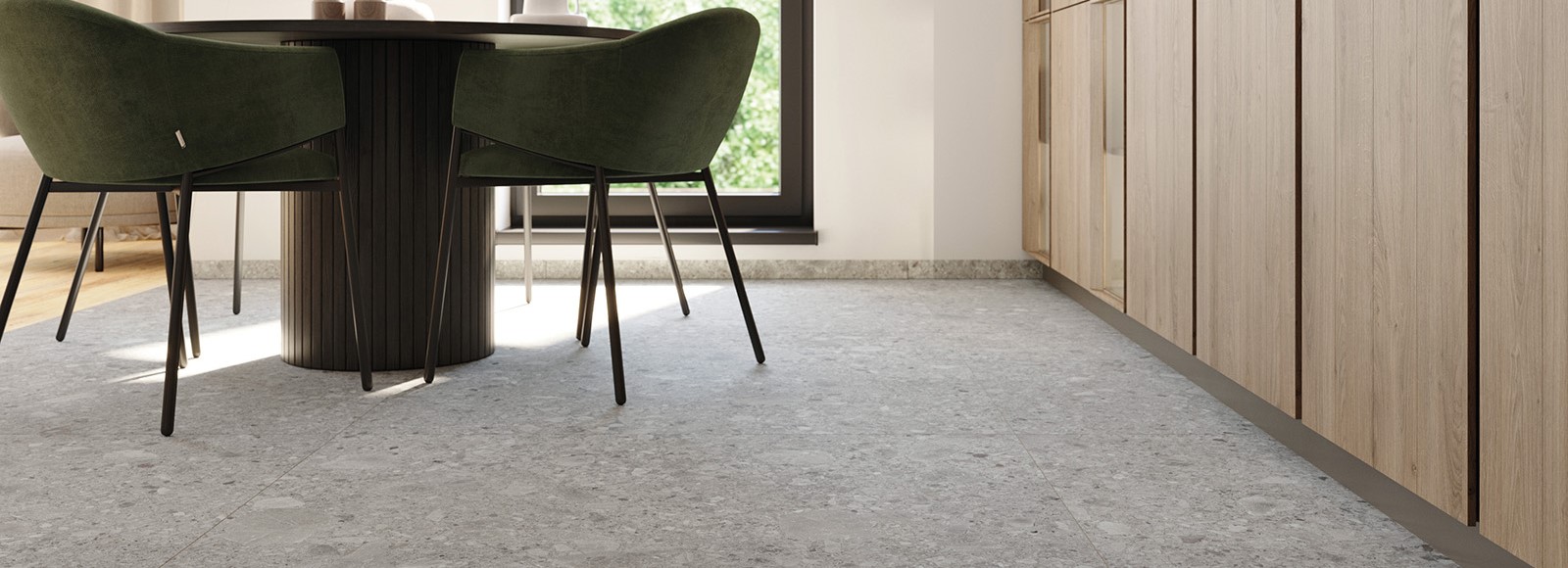 Design charakterizuje šedá barva a nepravidelná struktura, která vzniká díky masivnímu výskytu různě velkých omletých kamínků. Výsledkem jsou jedinečné dlaždice z rukou našich designérů, kteří se snažili do jednotlivých povrchů dlaždic promlouvat skrze detaily, aby tradiční kámen získal modernější vzhled a zachoval si svou původní krásu.