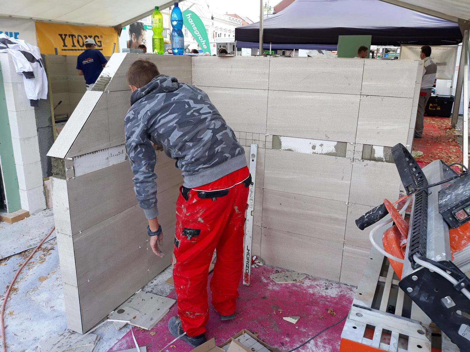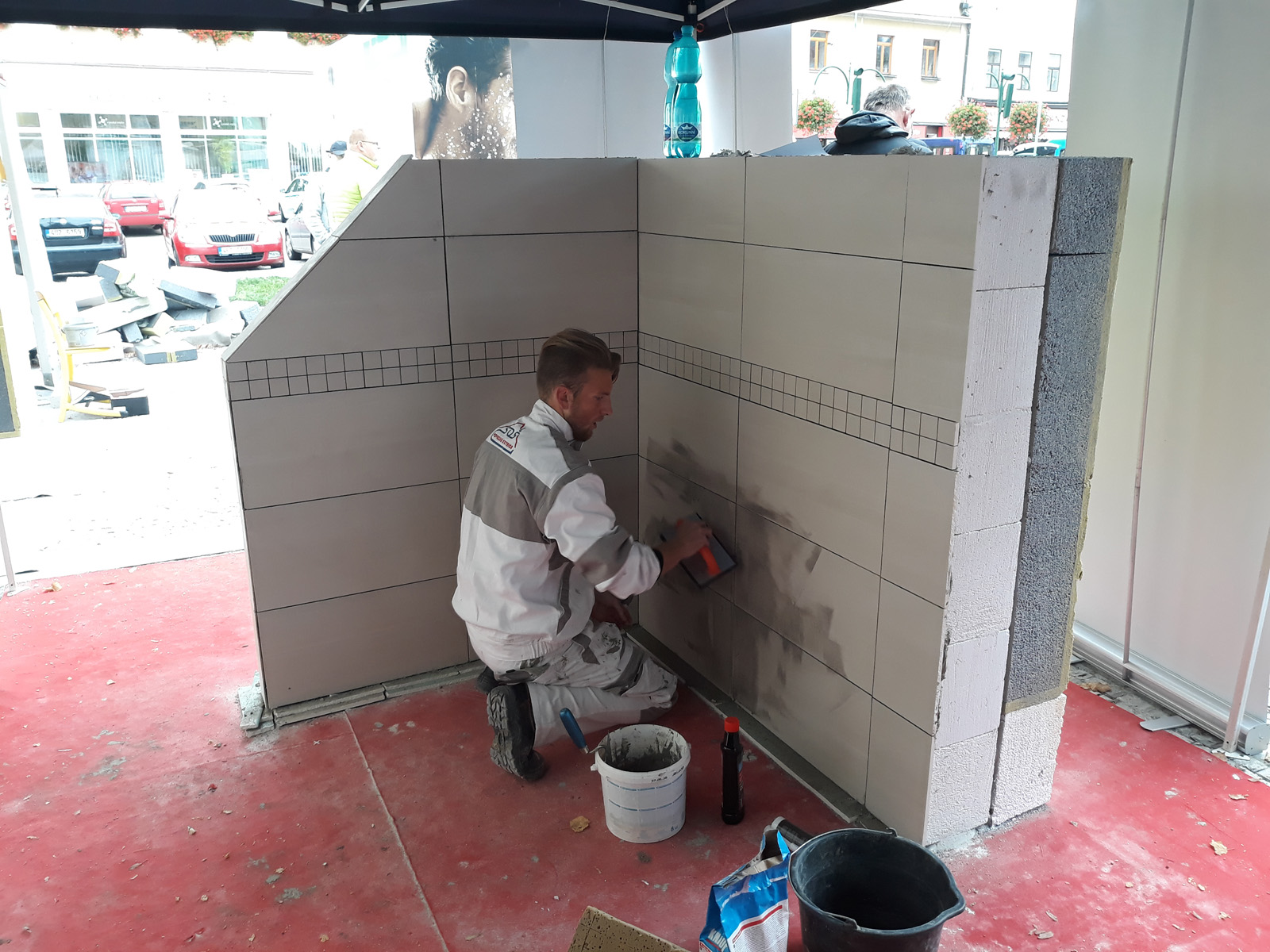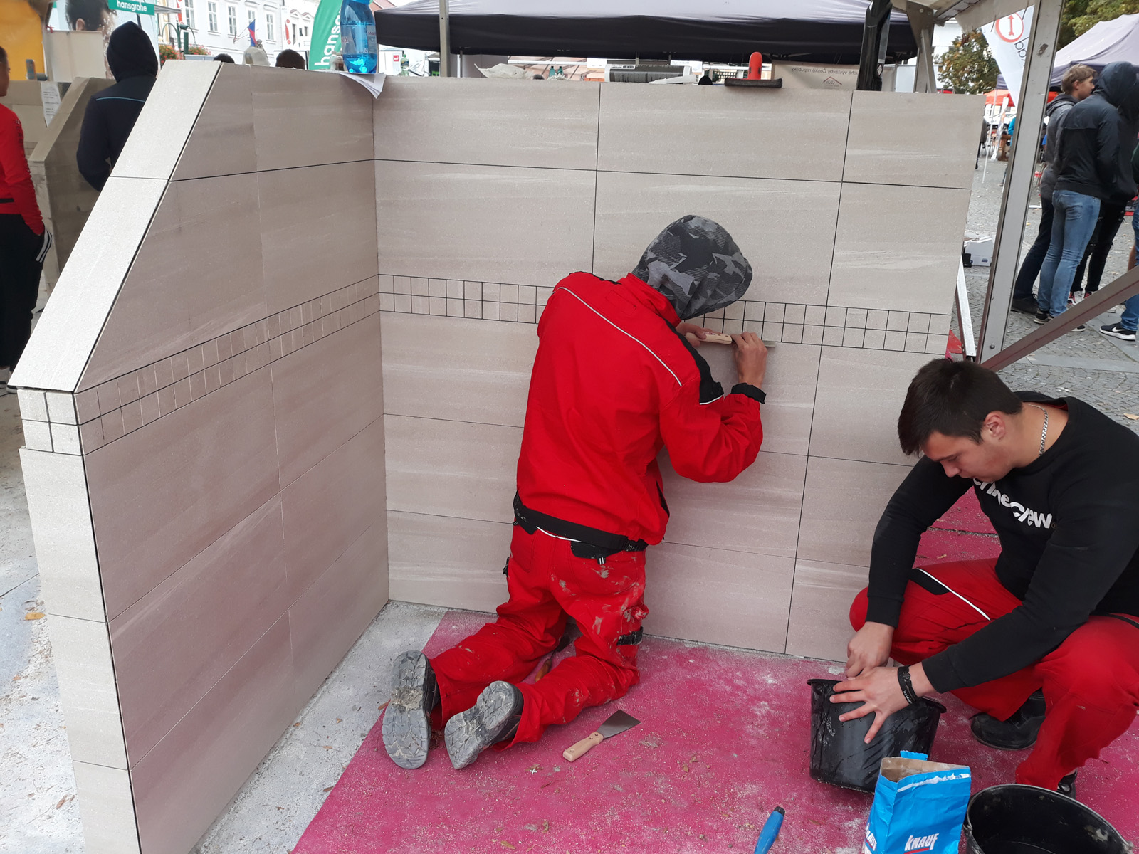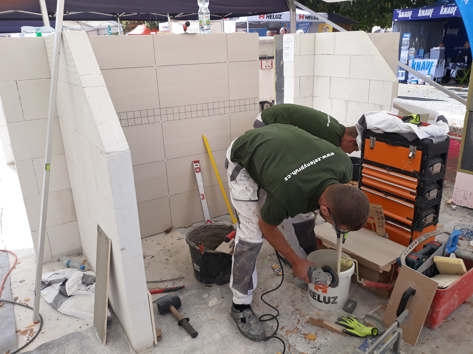 Budoucí instalatéři Honza a Adam z VOŠ stavební a SŠ stavební ve Vysokém Mýtě připravovali hned vedle pod dalším stanem ve vyzděném prostoru vše potřebné pro instalaci sprchy a WC. Vedle nich totéž prováděli Milan a Jakub ze Střední školy obchodu, řemesel a služeb v Žamberku, kteří si vybraný obor chválí. Jim i ostatním týmům byl nablízku Ivo Fischer z Alcaplastu: „Zde vzniká zjednodušená ukázka instalací pro budoucí sprchový kout a WC. Chlapci provádějí na jedné straně úpravu pro sprchovou baterii a na druhé straně montáž pro WC. Základ je ve škole naučí mistři, hodně se naučí na stavbách a práci s materiály je naučí zástupci firem.“ Honza a Adam se povzbuzují a připomínají, že zadáním je dokončit úkol co nejpřesněji a výsledek také musí dobře vypadat. „Zatím jsme spokojení, snad to „dáme“, povzbuzují se. Navazují na práci zedníků, a pokud ti by jim postavili zdivo křivě, museli by jej místy vyrovnat. Zkrátka praktická škola života. „Soutěží se účastní třetí ročníky, kluci by po vyučení měli být úplně samostatní, takže už za tři čtvrti roku bychom je mohli potkat někde na stavbě,“ uvědomuje si Ivo Fischer.