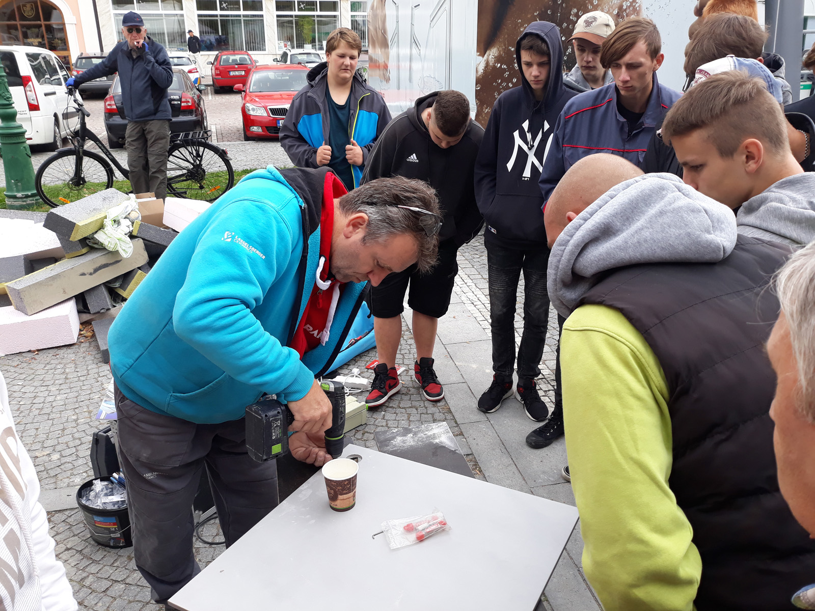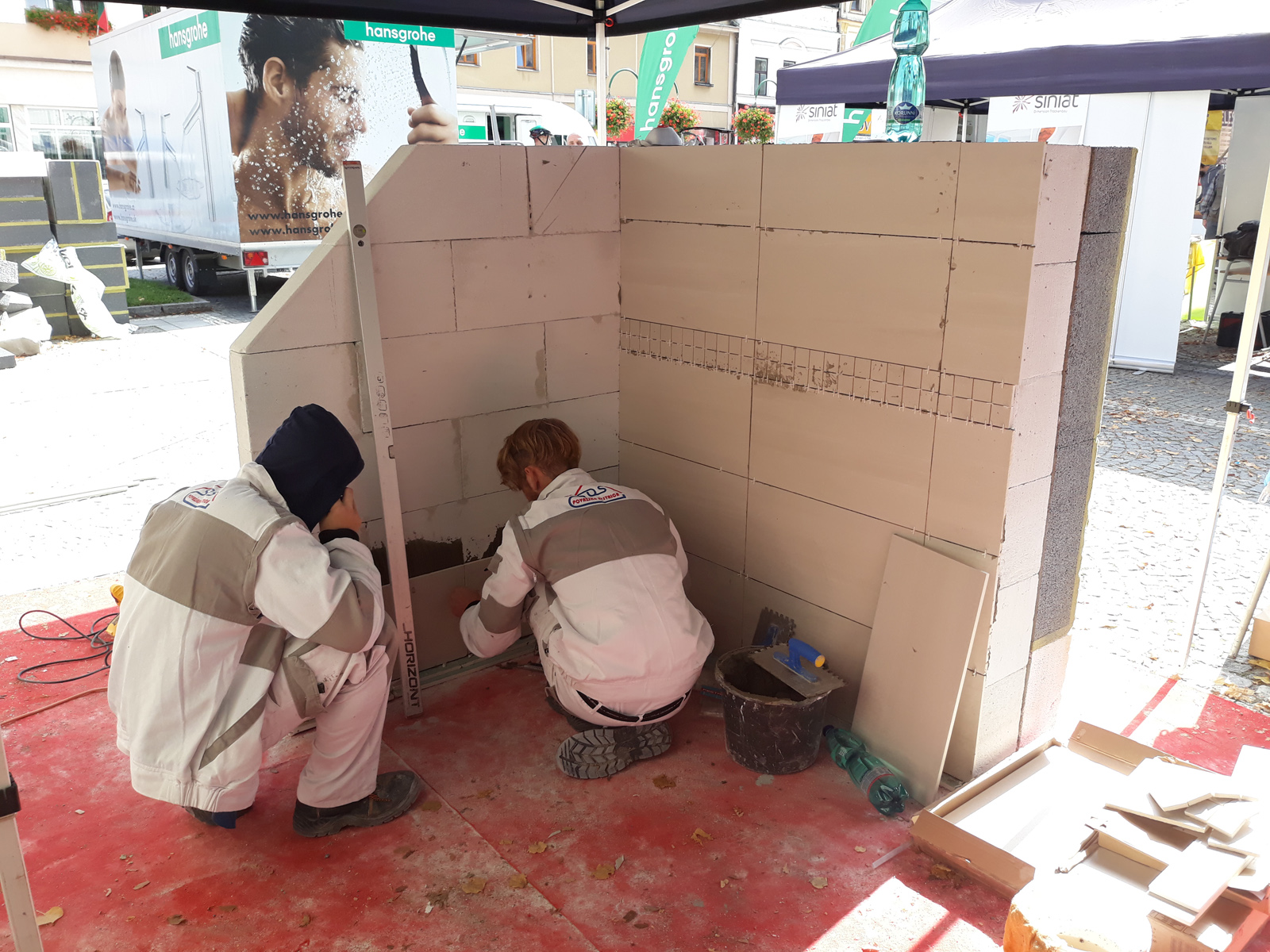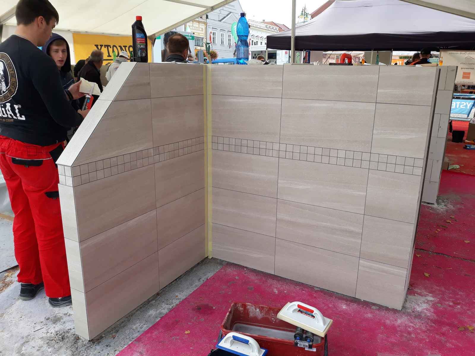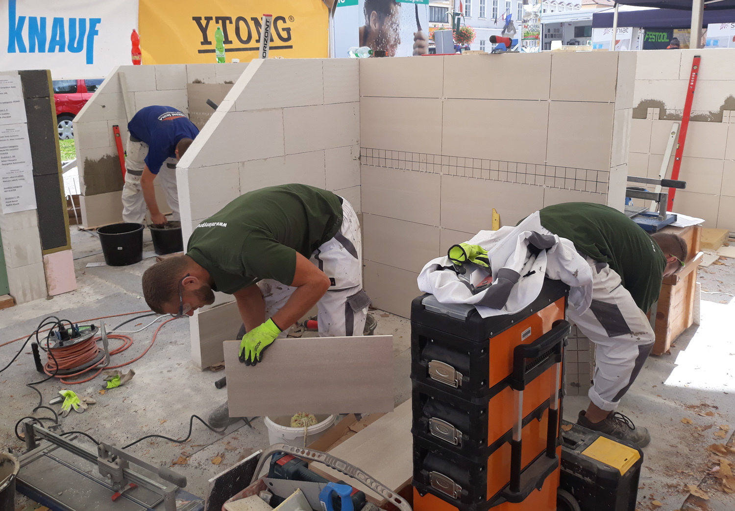 Budoucí instalatéři Honza a Adam z VOŠ stavební a SŠ stavební ve Vysokém Mýtě připravovali hned vedle pod dalším stanem ve vyzděném prostoru vše potřebné pro instalaci sprchy a WC. Vedle nich totéž prováděli Milan a Jakub ze Střední školy obchodu, řemesel a služeb v Žamberku, kteří si vybraný obor chválí. Jim i ostatním týmům byl nablízku Ivo Fischer z Alcaplastu: „Zde vzniká zjednodušená ukázka instalací pro budoucí sprchový kout a WC. Chlapci provádějí na jedné straně úpravu pro sprchovou baterii a na druhé straně montáž pro WC. Základ je ve škole naučí mistři, hodně se naučí na stavbách a práci s materiály je naučí zástupci firem.“ Honza a Adam se povzbuzují a připomínají, že zadáním je dokončit úkol co nejpřesněji a výsledek také musí dobře vypadat. „Zatím jsme spokojení, snad to „dáme“, povzbuzují se. Navazují na práci zedníků, a pokud ti by jim postavili zdivo křivě, museli by jej místy vyrovnat. Zkrátka praktická škola života. „Soutěží se účastní třetí ročníky, kluci by po vyučení měli být úplně samostatní, takže už za tři čtvrti roku bychom je mohli potkat někde na stavbě,“ uvědomuje si Ivo Fischer.