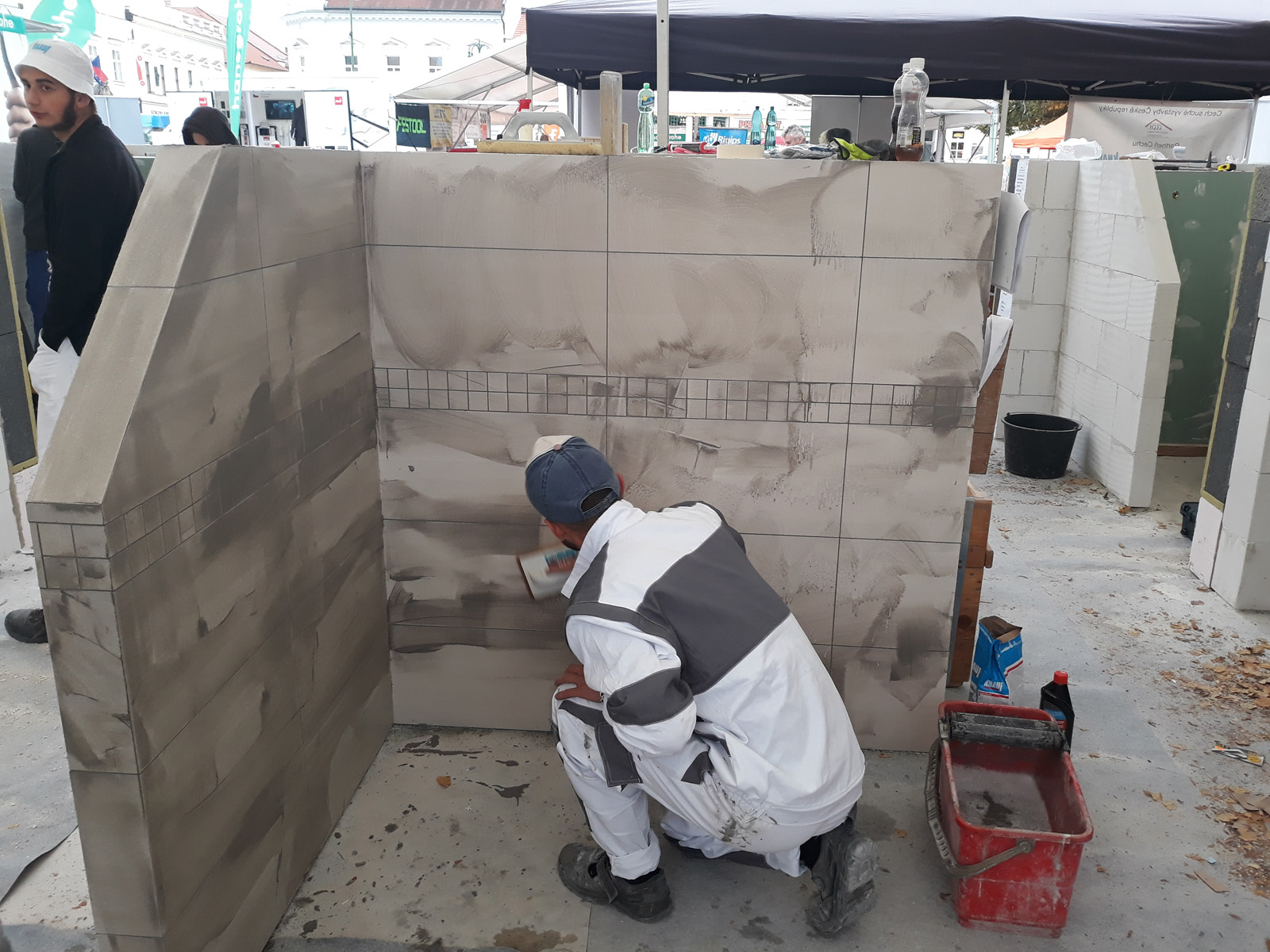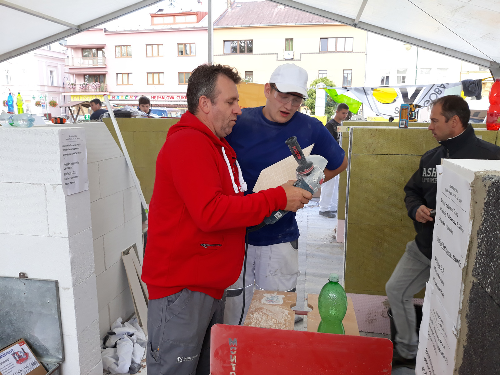 Budoucí zedníky z Odborného učiliště a Praktické školy Hlučín Petra Polhoše a Patrika Kolarčíka jsme zastihli v plné práci. „Zateplujeme tuhle nosnou zeď za pomocí polystyrénu a zatím nám to jde dobře,“ uvedli. Jejich mistr odborného výcviku Marek Mrovec je sledoval zpovzdálí, protože mistři do průběhu soutěže mluvit nemohou, a držel jim palce. „Včera si tuhle zeď, která je z Ytongu, nejdříve sami postavili a dnes ji zateplují materiálem z Isoveru. Až to dodělají, přejdou k protějšímu stanu, kde mají připravenou další vyzděnou zeď a tu budou pro změnu omítat.“ Pedagog byl s jejich dosavadní prací spokojen. „Jsou šikovní. Do soutěže byli „hozeni“ dost divoce, protože jsme se rozhodli zúčastnit na poslední chvíli a měli jsme na přípravu jen pár dnů. Přijeli jen s tím, co znají z praxe. Chodíme s nimi po zakázkách, takže zateplování vidí v reálu. Myslím, že poslední nebudou.“ A nebyli. Za své dílo si odvezli do Hlučína 2. místo v kategorii Zednické práce.