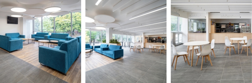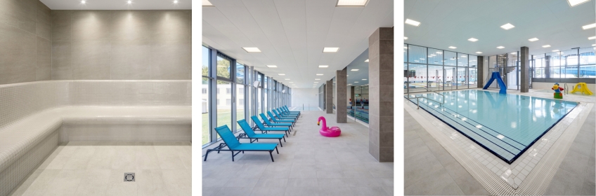 V bazénové hale byly použity keramické obklady sérií Pool a Color Two v decentních odstínech, které podporují dojem čistoty a světlosti. Konstrukční prvky sloupů jsou zvýrazněny obklady imitujícími beton ze série Cemento. Architektonický návrh zahrnoval i interiéry navazujících prostor, včetně zóny občerstvení. „Ve vstupní hale převládají zemité a útulné tóny – tmavší dlažba 60 × 60 a 30 × 60 cm Quarzit doplněná nábytkem v dekoru dubu. Barvu šatních skříněk volil investor. Výsledná podoba projektu je také zásluhou vedení stavby, které sehrálo klíčovou roli v realizaci,“ uzavírá architekt Kadečka.