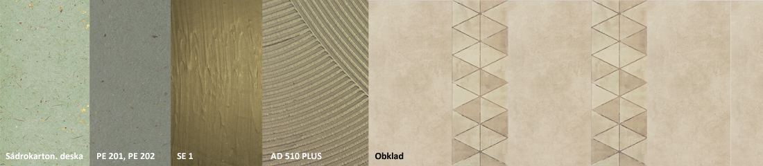 Montáž keramických obkladů a dlažeb na izolační vrstvu:  Pro montáž obkladů a dlažeb je nutno použít modifikované lepicí tmely. Pro standardní formáty našeho bytového keramického programu používáme cementové lepidlo AD510 News třídy C2T nebo plně flexibilní lepidlo AD530 nebo AD550. Spotřeba lepidel se pohybuje od 3 do 6 kg/m2.