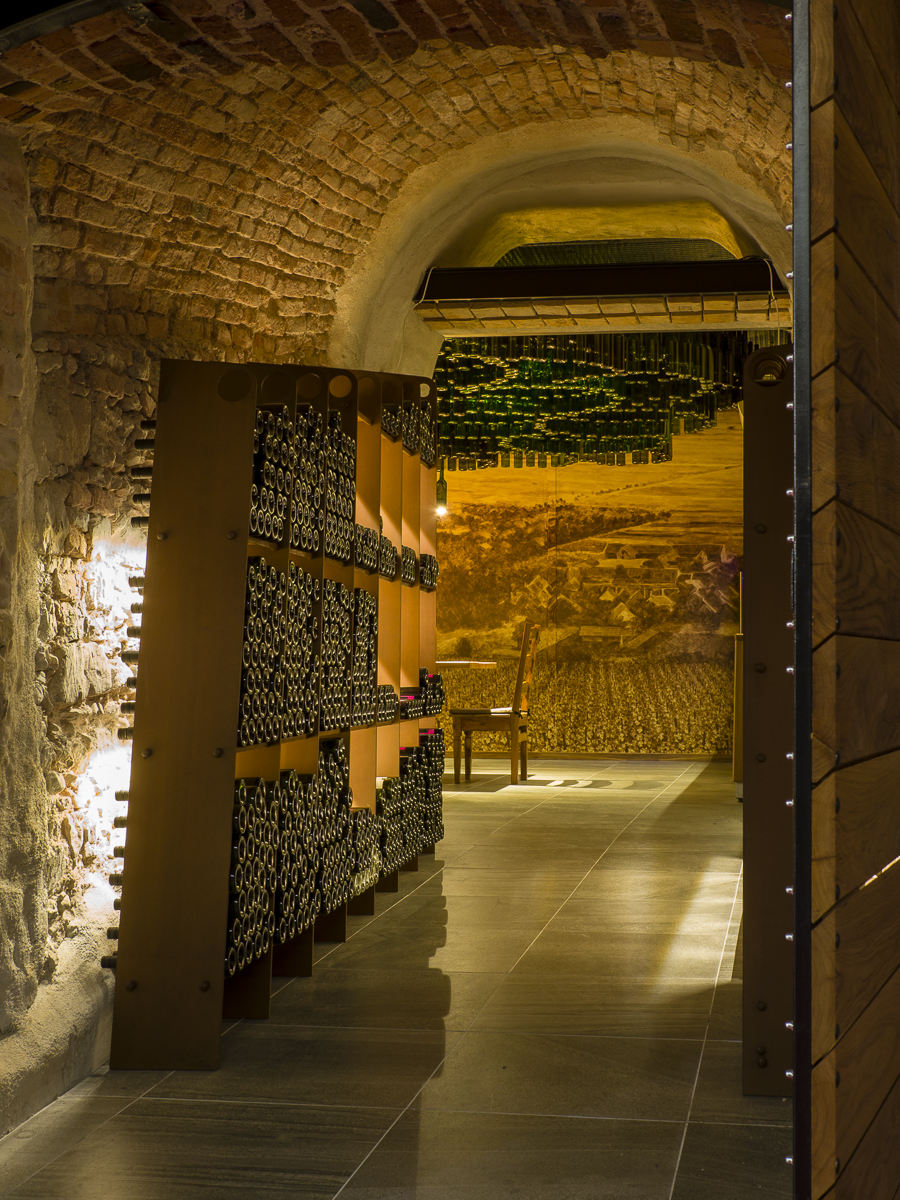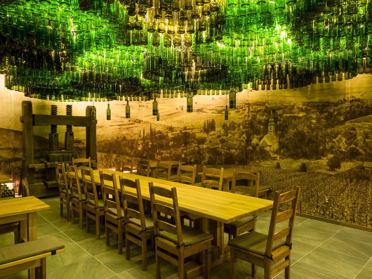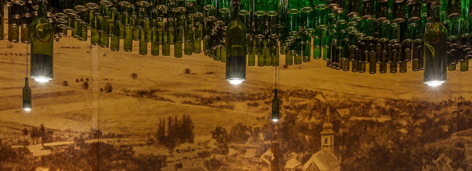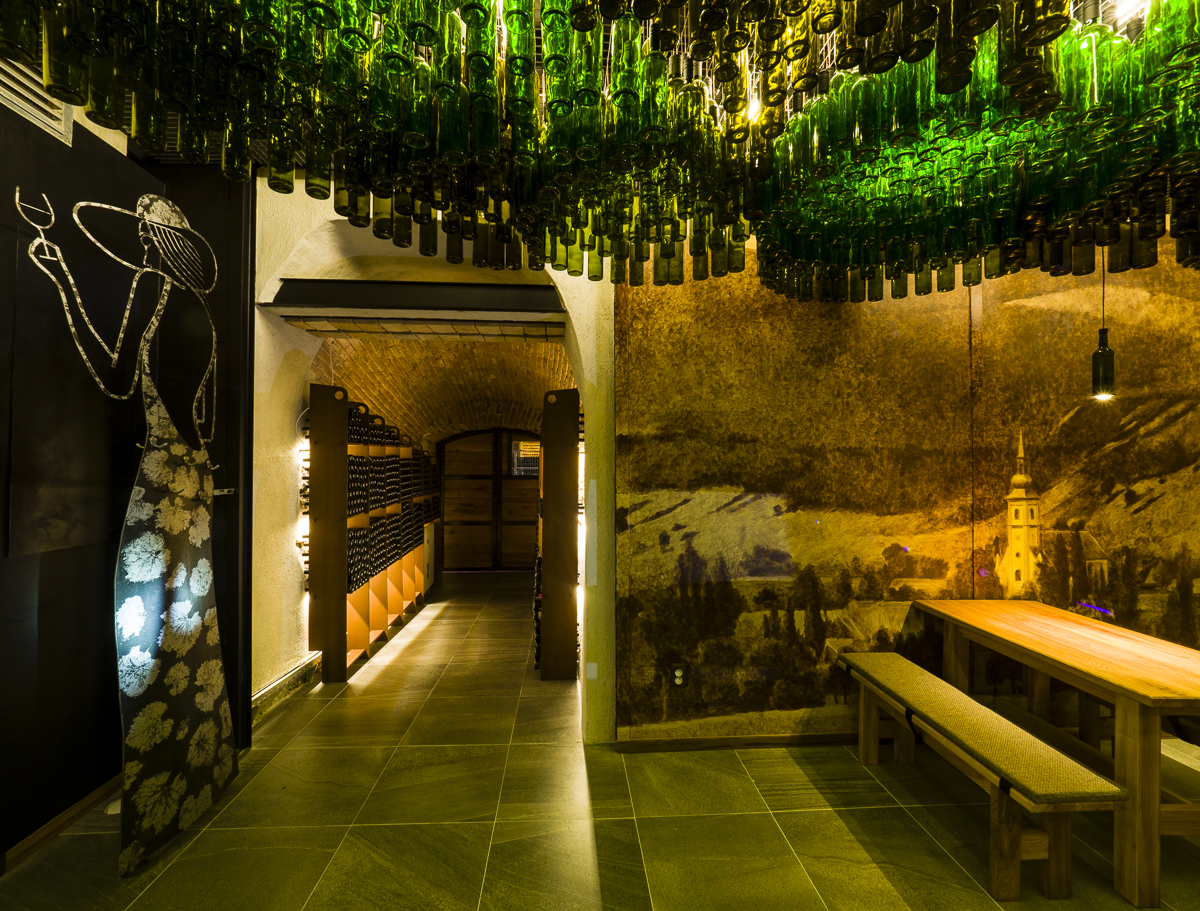 Ale zpět ke sklepu s historickými cihlovými klenbami, odkud se krátkou chodbou vstupuje do degustační místnosti, jejíž interiér byl dokončený koncem minulého roku. Jako první Vaši pozornost na stropě upoutá kompozice 3 300 prázdných lahví od vína. „ V návrhu jsme vycházeli z historie a génia loci, kompozice má evokovat hrozen vína,“ doplňuje autor interiéru Ing. Radovan Rusnák. „Láhve jsou jako bobulky hrozna, přičemž jsou v kruzích upevněné do klenby, ve kterých je okrajová křivka nejnižší a každá další řada stoupá. Lahve mají tři druhy barevných odstínů a jsou nasvícené LED technologií s možností ovládání intenzity svetla.“