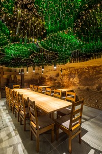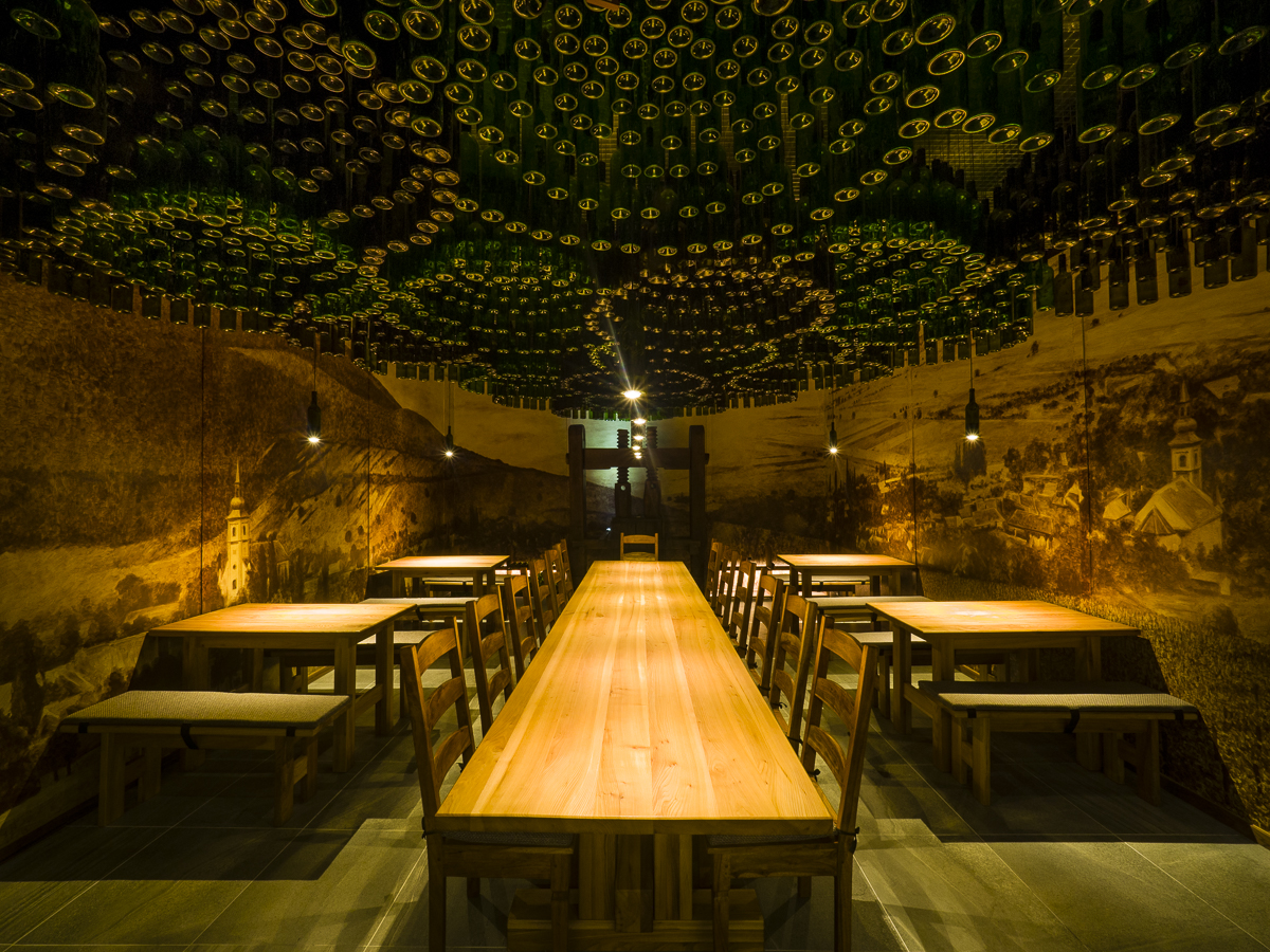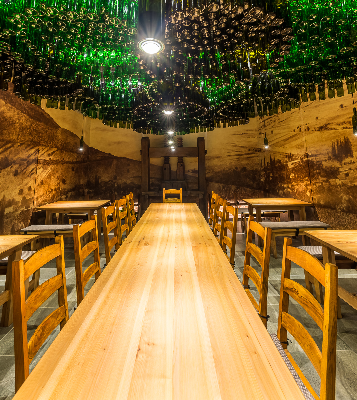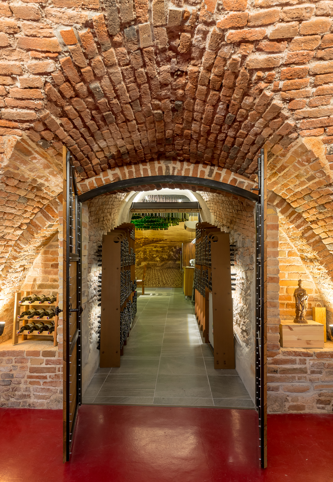 Ale zpět ke sklepu s historickými cihlovými klenbami, odkud se krátkou chodbou vstupuje do degustační místnosti, jejíž interiér byl dokončený koncem minulého roku. Jako první Vaši pozornost na stropě upoutá kompozice 3 300 prázdných lahví od vína. „ V návrhu jsme vycházeli z historie a génia loci, kompozice má evokovat hrozen vína,“ doplňuje autor interiéru Ing. Radovan Rusnák. „Láhve jsou jako bobulky hrozna, přičemž jsou v kruzích upevněné do klenby, ve kterých je okrajová křivka nejnižší a každá další řada stoupá. Lahve mají tři druhy barevných odstínů a jsou nasvícené LED technologií s možností ovládání intenzity svetla.“