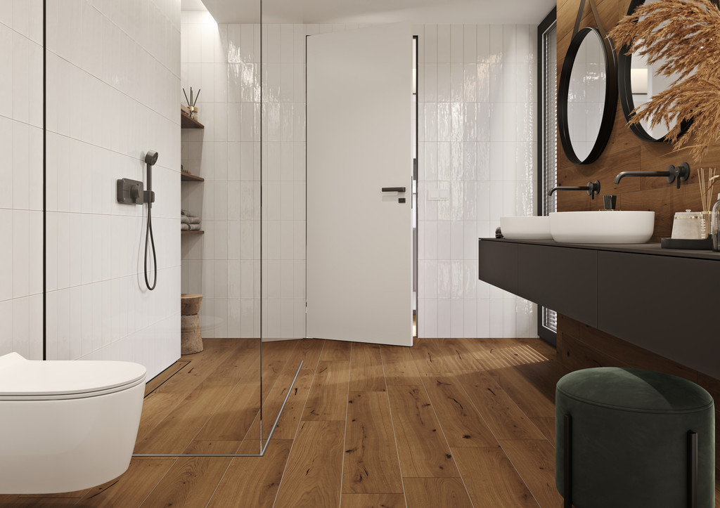 Optické propojení koupelny s navazujícím sprchovým koutem je díky identickému designu použité dlažby stylově jednoduché a přitom elegantní řešení. Variabilitu „řešení na míru“ podporuje široká nabídka formátů a povrchů dlažeb. Značka RAKO nabízí kombinace větších (120 x 120, 60 x 120, 80 x 80, 60 x 60 cm atd.) a menších formátů (5 x 5 cm, 10 x 10 cm atd.) v rámci jedné série (viz. foto níže vlevo) i zajímavé kombinace různých sérií (viz. foto níže vpravo).