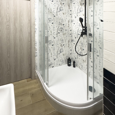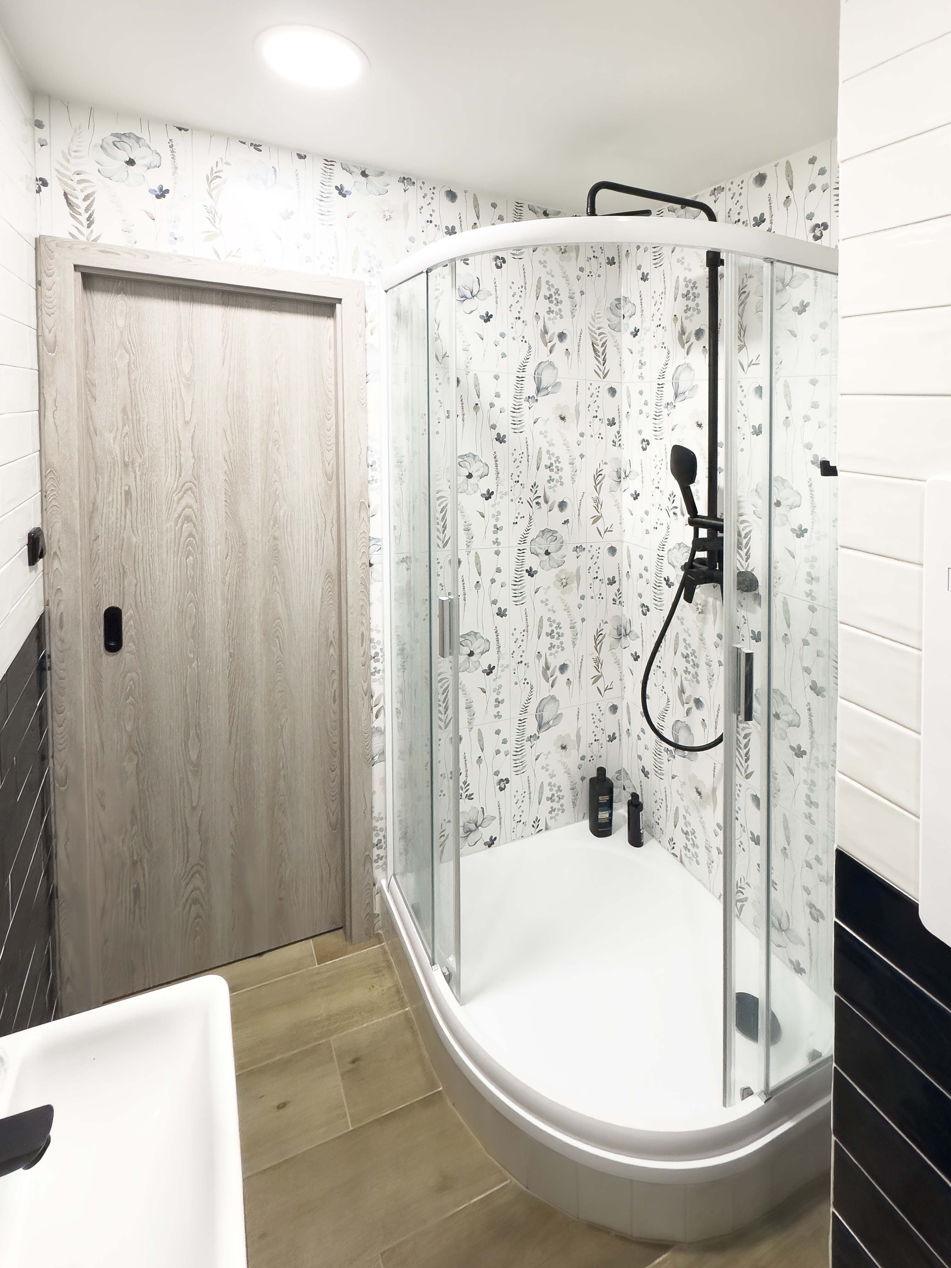 Jedním z prvků, které na první pohled zaujmou, je květinový motiv použitý ve sprchovém koutu. Tento zajímavý detail dodává prostoru lehkost a zjemňuje celkový vzhled. Květinové vzory navozují pocit klidu a útulnosti – což se ocení zejména v koupelně bez přirozeného světla.