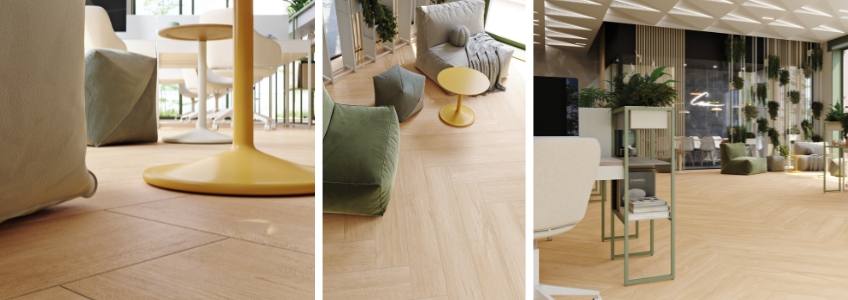 PLANK is complemented by a 30 x 90 cm wall tile with a striking mosaic look in a matt-gloss combination. The durable interior tiles are water, scratch and chemical resistant. They are also perfect for floors with underfloor heating and are easy to clean.