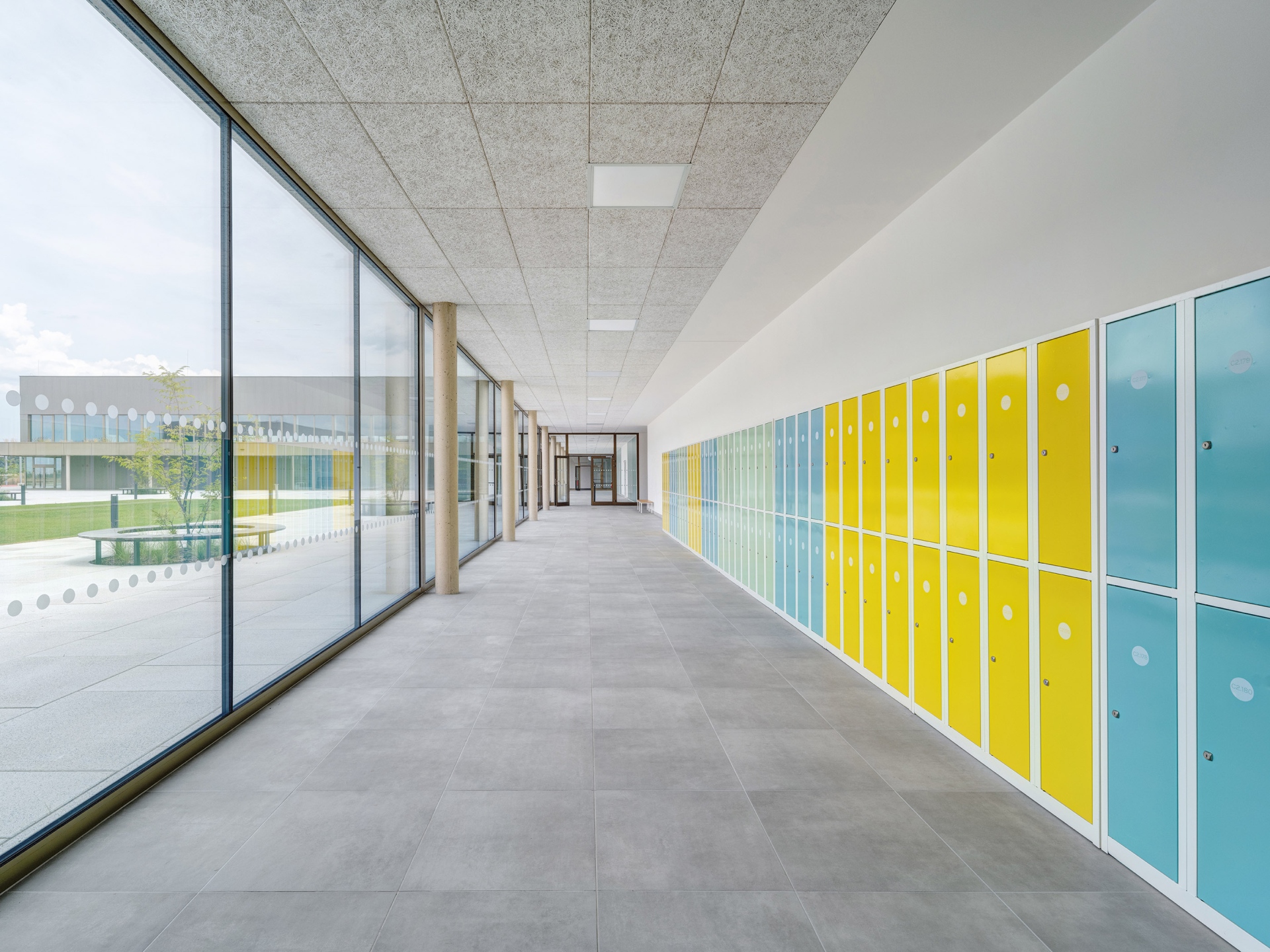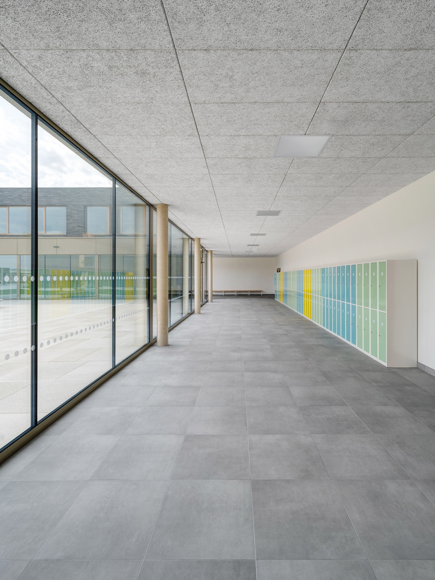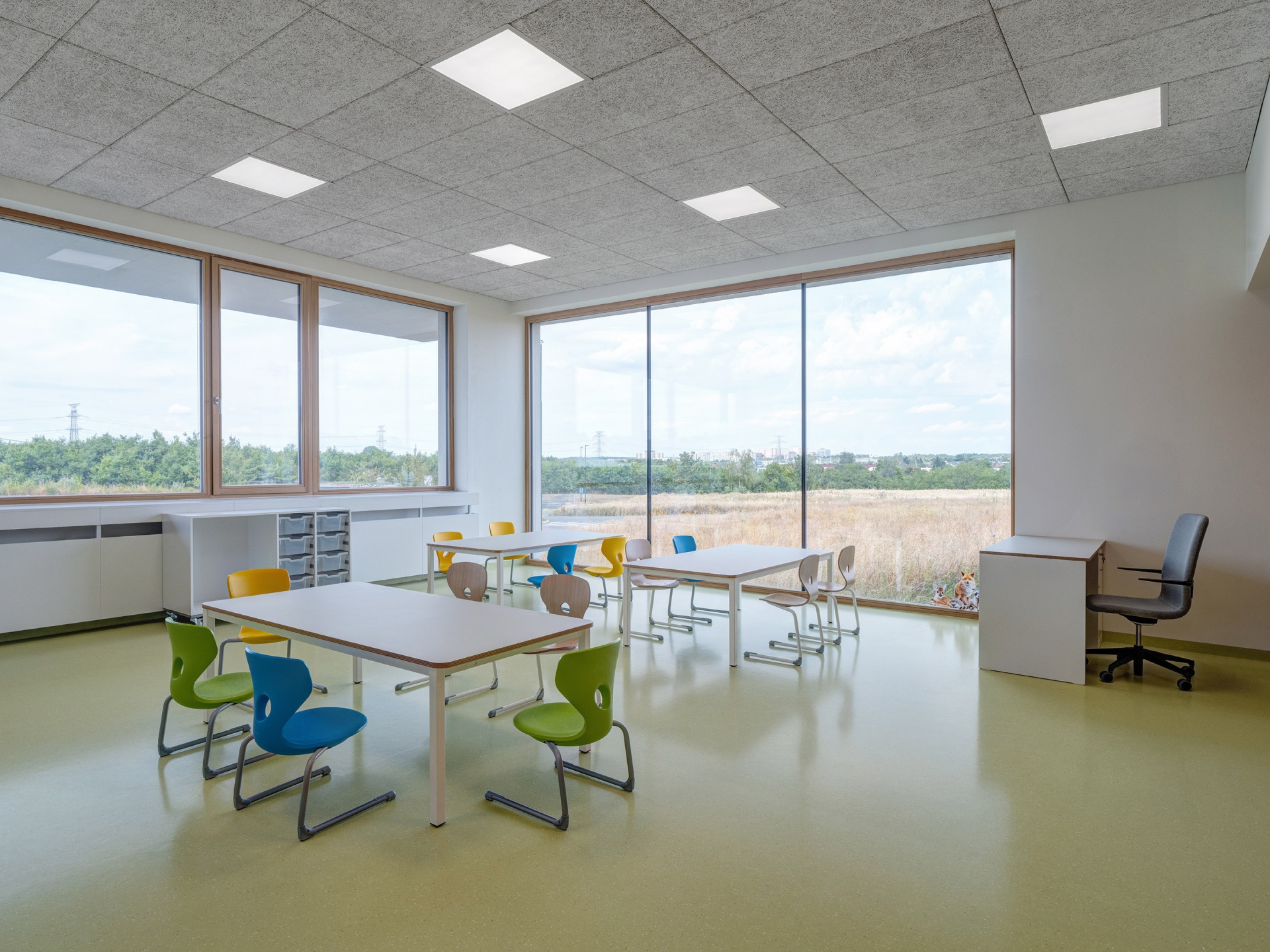 The multi-storey educational complex embodies the architectural style of the 21st century, but it also features traditional building elements and materials – glass copilit walls, exposed Heraklit (wood wool insulation boards) in the suspended ceilings and large-format ceramic tiles dominating the floor. The façade and shape of the building espouse its Functionalist roots. The co-author of the design answers the question as to whether this was the direct intention – to make that connection, to commemorate, to build on... “Yes, we definitely wanted to build on the good things brought by Czech modern architecture, while also drawing inspiration from abroad. The project was created in response to demographic growth in the outskirts of Prague and provides capacity for eighteen classrooms. The architectural design emphasises a functionally structured mass and high-quality public space."