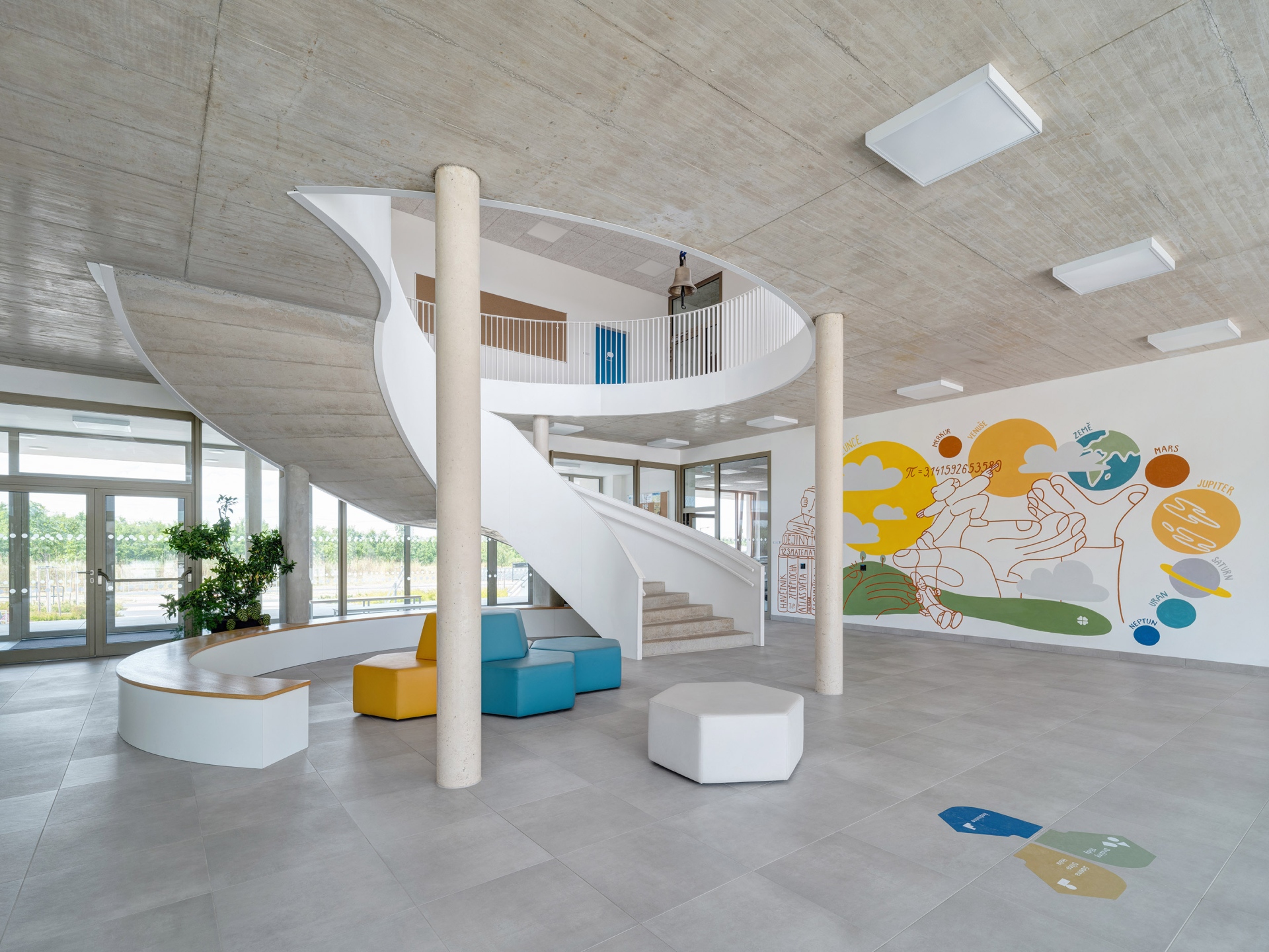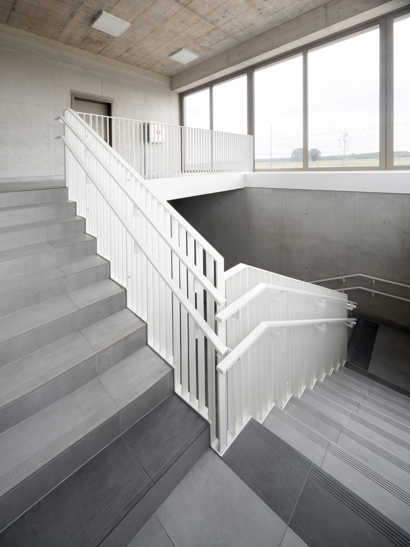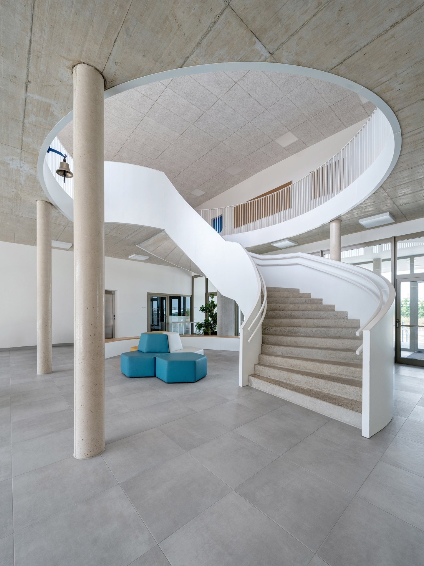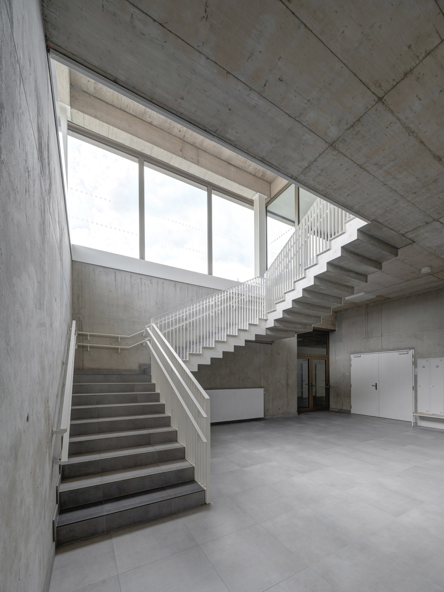 The first- and second-grade primary school has been generously designed to facilitate modern teaching, sports and leisure activities, and includes a well-equipped catering facility, dining hall, library, after-school club and other facilities. The complex consists of three two-storey wings arranged in a U-shaped formation. The main building provides a link between the two parallel pavilions (which mainly contain classrooms). The architects designed the central staircase as a dominant feature made of monolithic concrete. The large school yard is bordered by a building with two gyms. Adjacent to them is a shelter with a sports field and an auditorium. The brick façade of most buildings underscores the sense of dignity and representativeness of the educational facility. For better orientation, the architects distinguished the shade of the main building’s façade from that of the adjacent buildings. The gym is deliberately visually contrasted thanks to a glass frame façade and cladding made of profiled sheets.