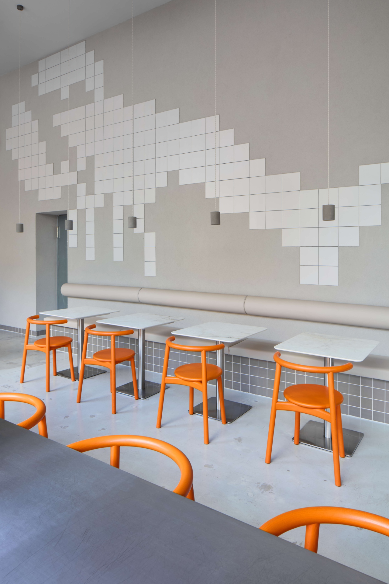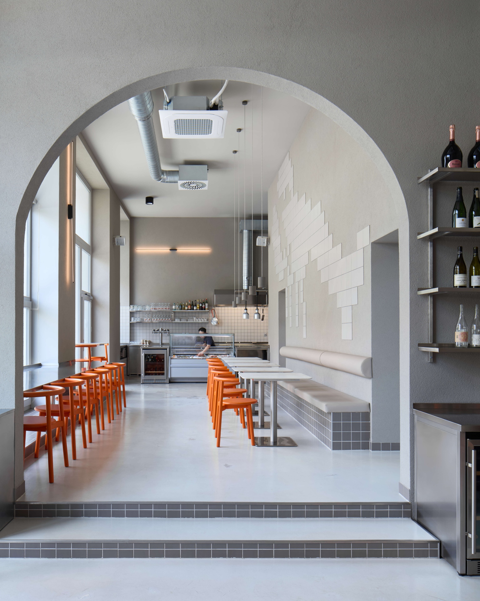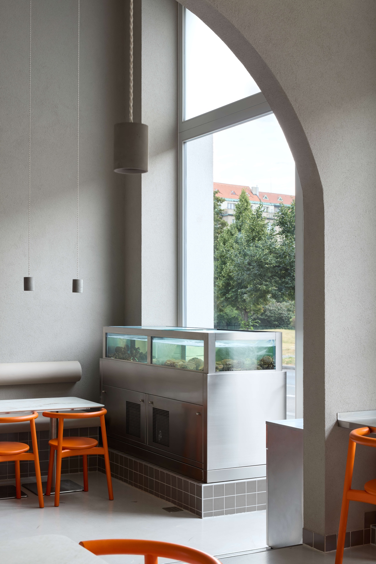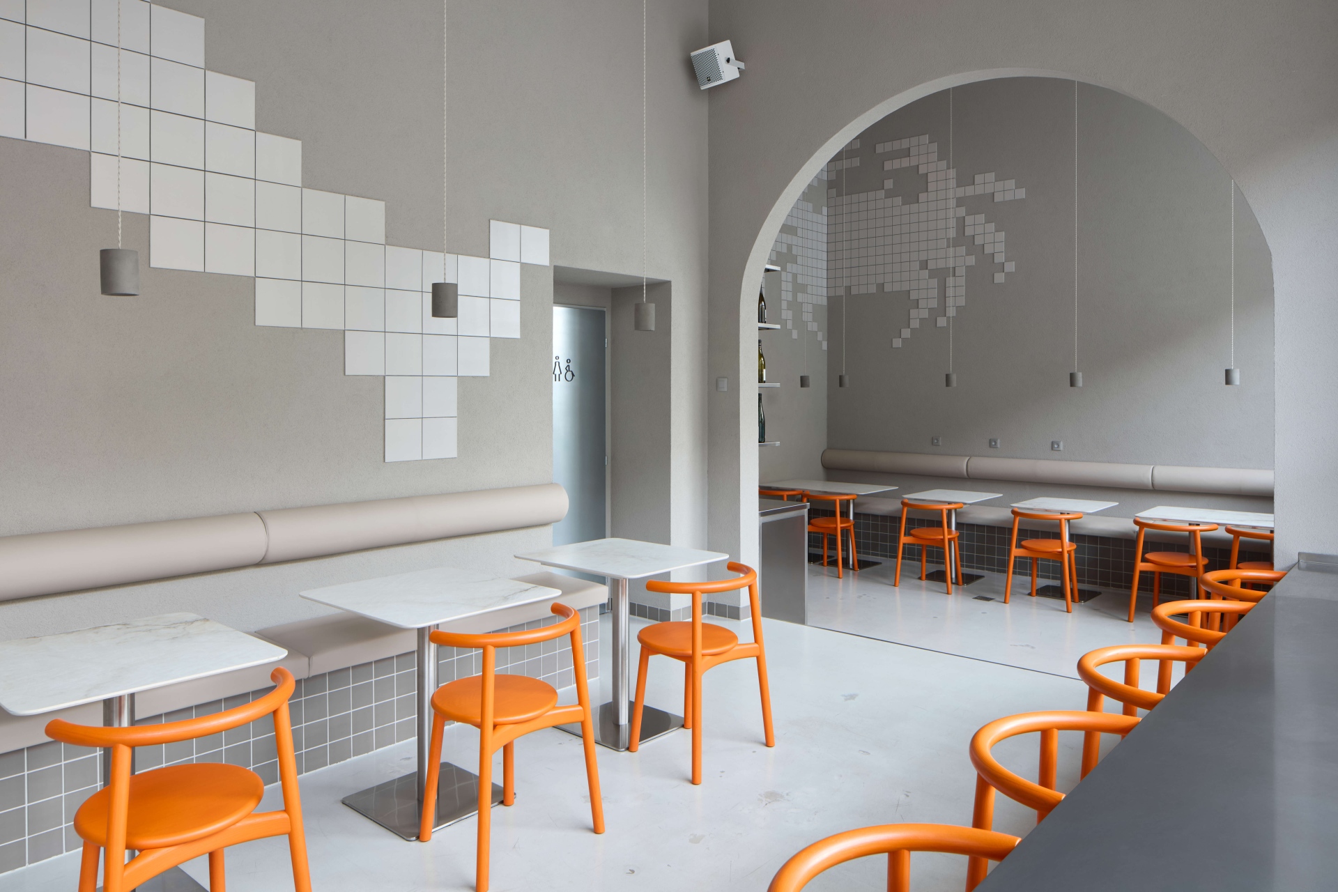The spacious interior of the Prague restaurant RAKIN is dominated by a crayfish from RAKA, together with a crab. Bright orange elements stand out against neutral gray materials, just like the seafood on the menu. The Czech brand RAKO helped architects create the image of a new Prague restaurant offering international cuisine focused on marine and freshwater creatures.