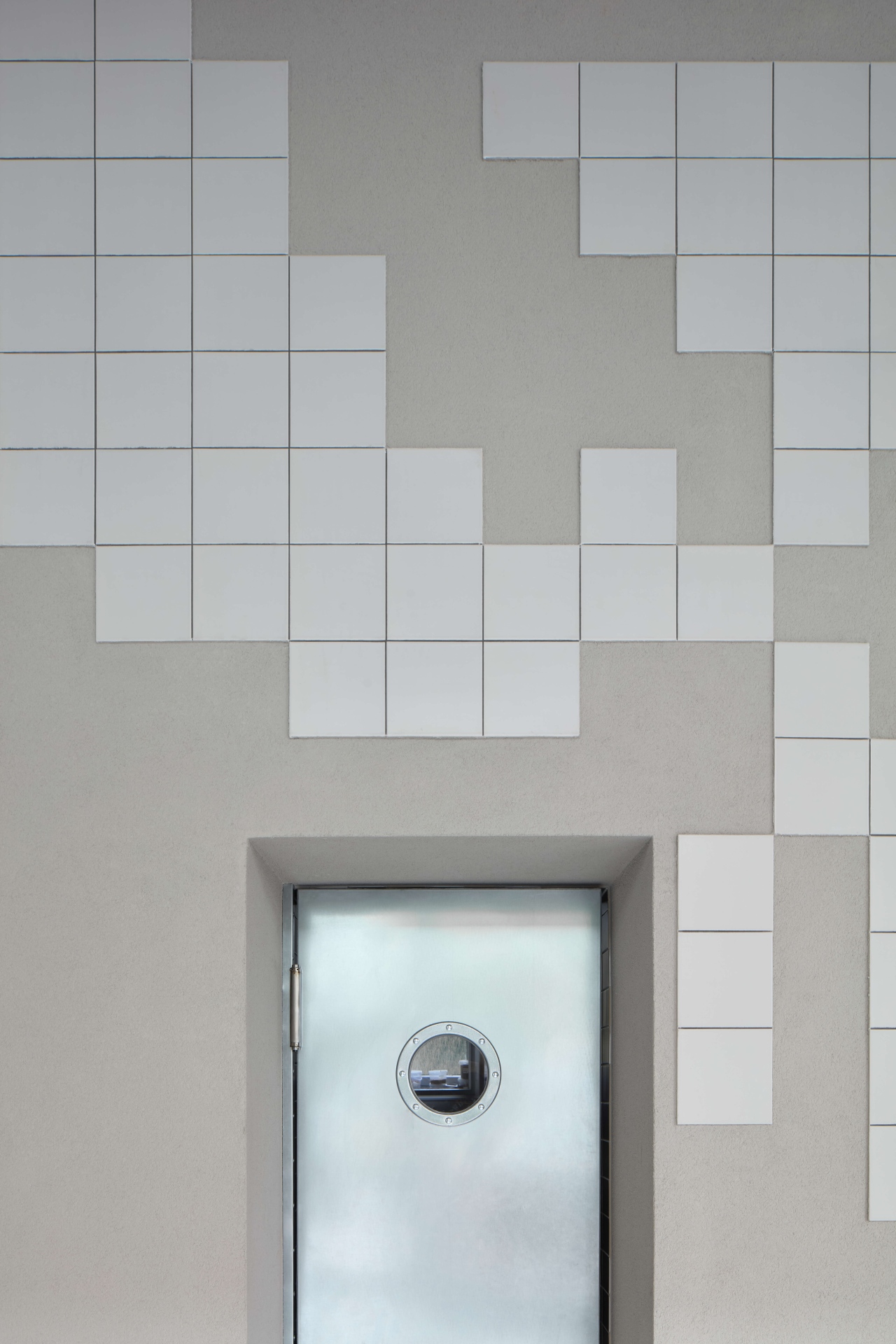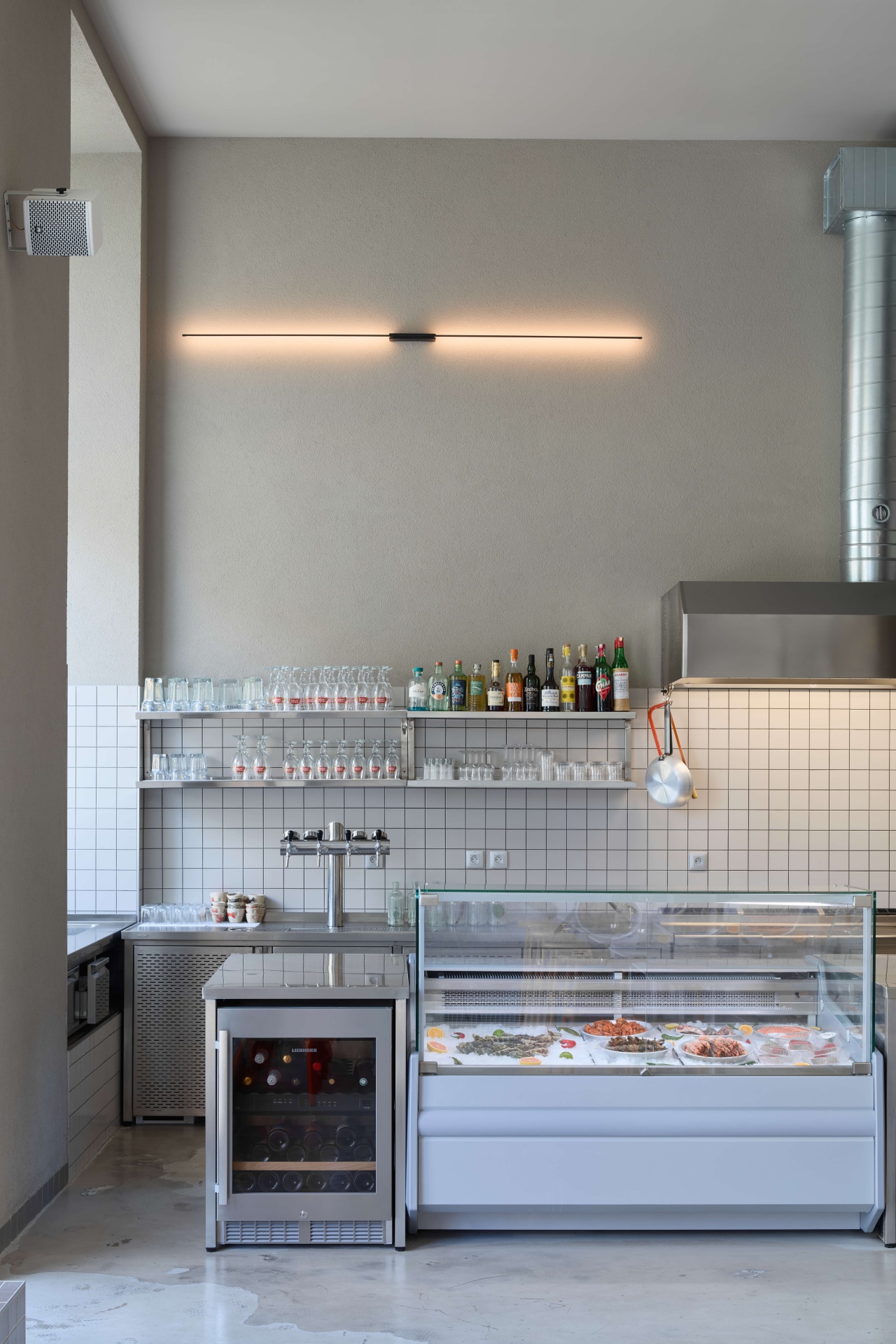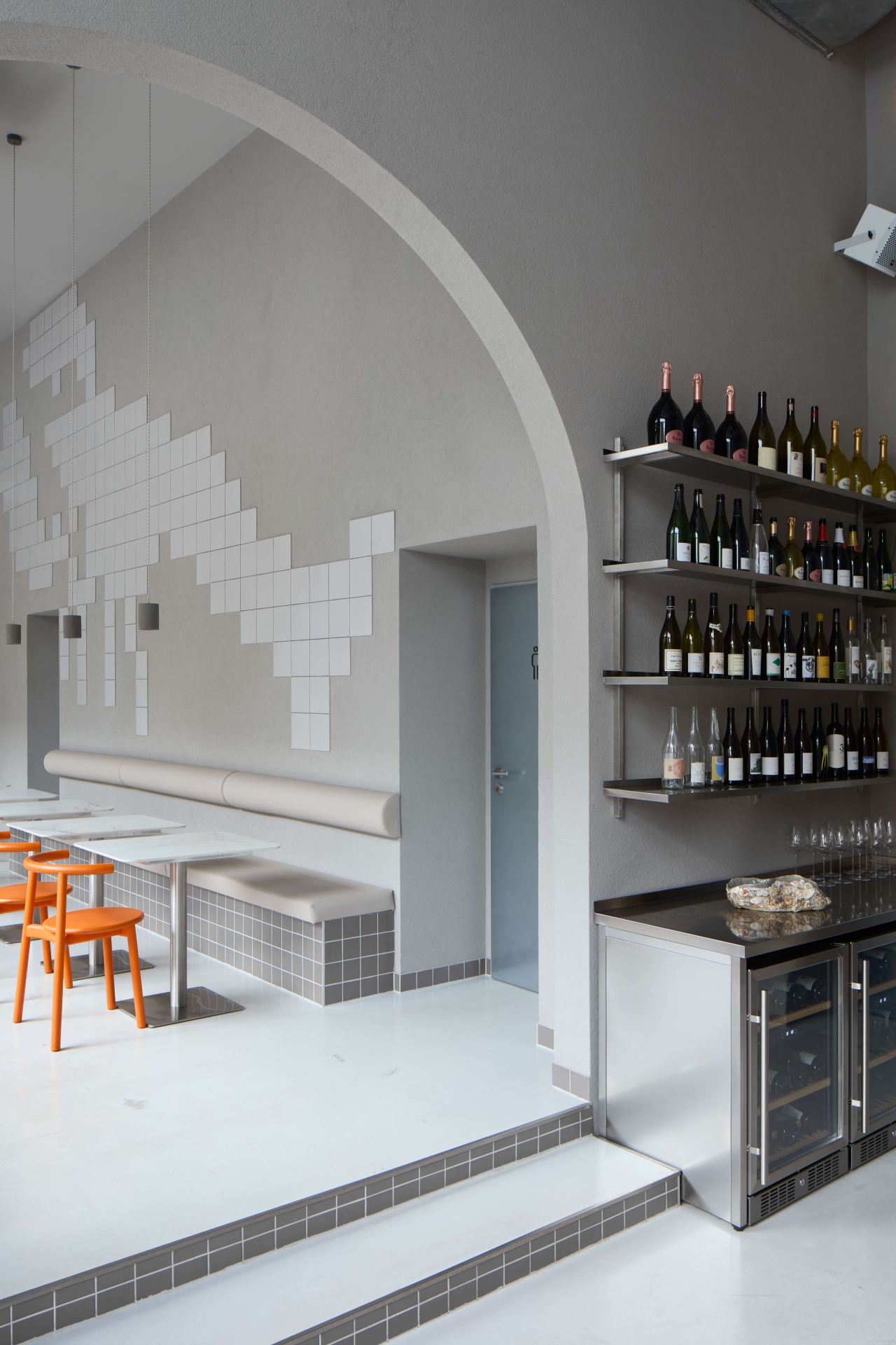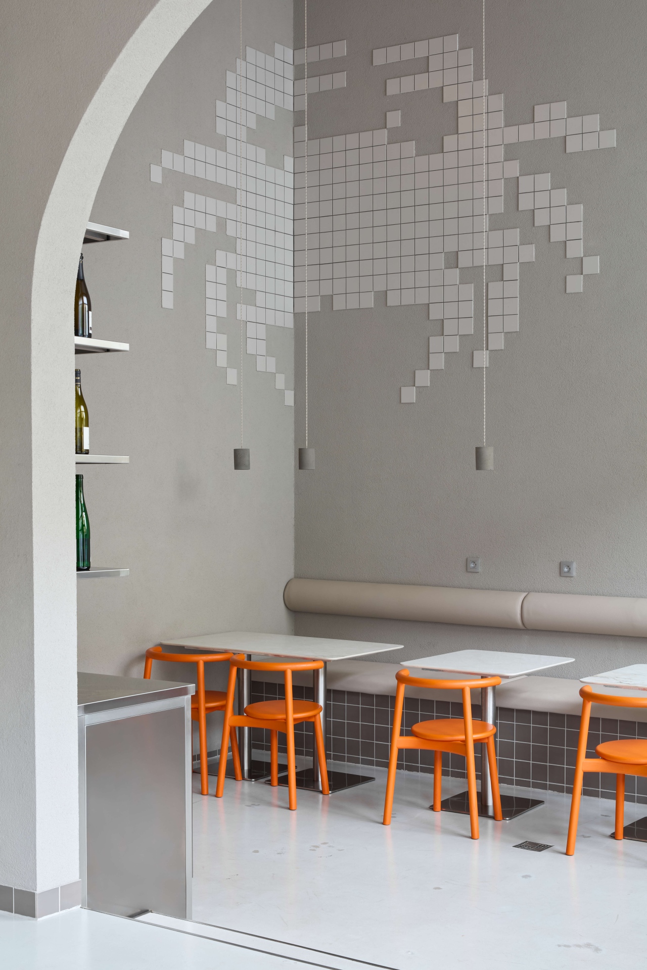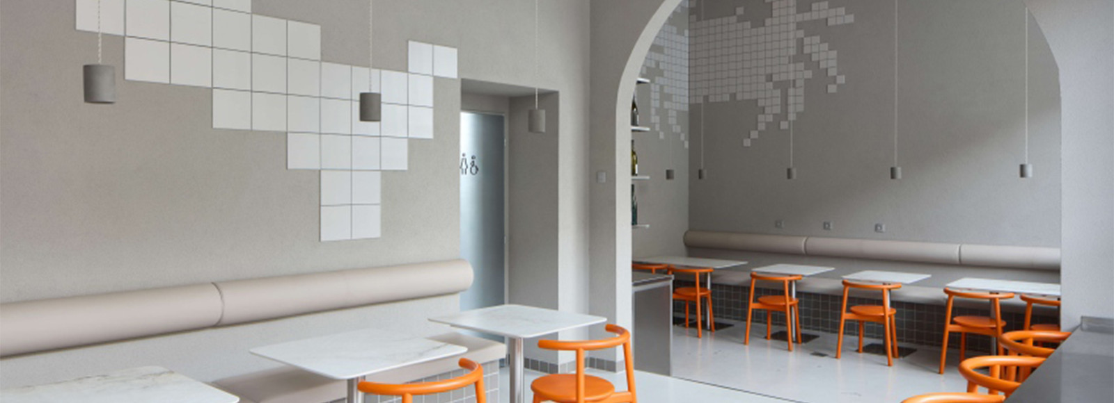 The spacious interior of the Prague restaurant RAKIN is dominated by a crayfish from RAKA, together with a crab. Bright orange elements stand out against neutral gray materials, just like the seafood on the menu. The Czech brand RAKO helped architects create the image of a new Prague restaurant offering international cuisine focused on marine and freshwater creatures.