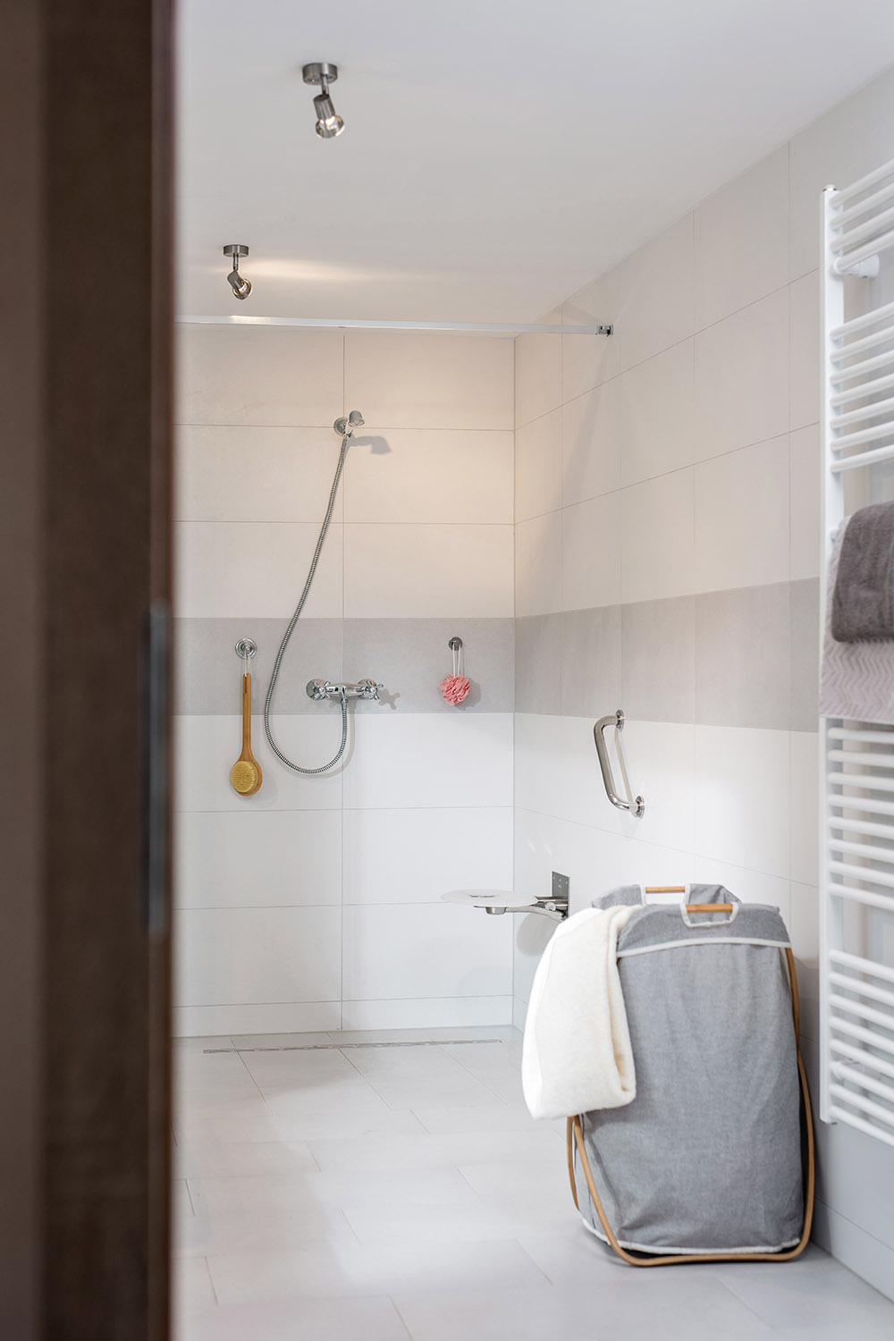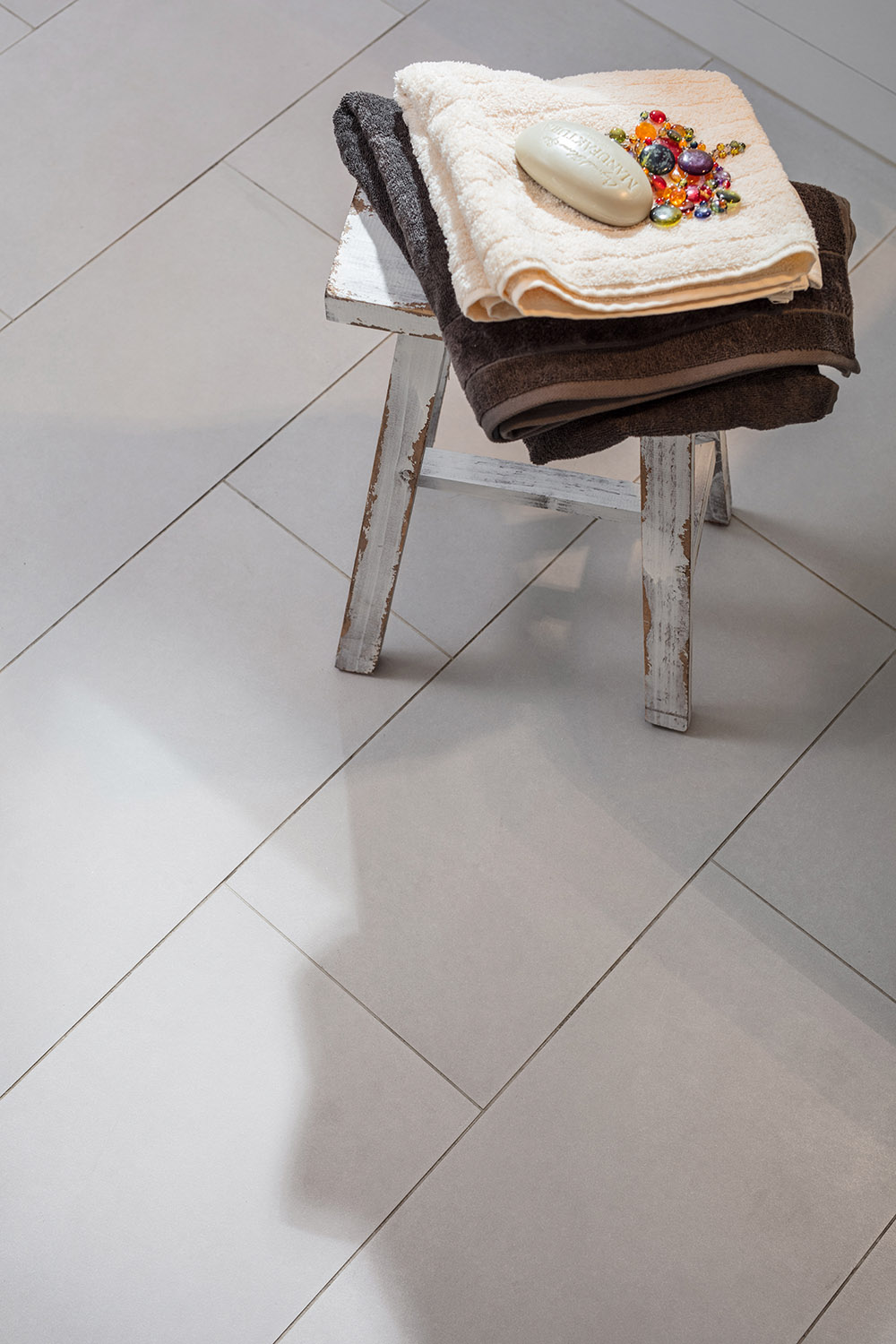 The Sandstone Plus series tiles were chosen, rectified stone effect floor tiles. The walls were tiled with the format 30 x 60 cm in light gray shade and the seamless surface was atractively broken with a darker stripe of tiles of the same series all around the bathroom. The grey shade of Sandstone Plus 30 x 60 has covered the floor as well. In the new bathroom, a solution for a washing machine, new bathroom cabinets and most importantly, the bath tub was replaced by a more convenient shower enclosure with a seat, to grandmother´s total satisfaction. All the more so, the winning in the competition was enough for both the tiling and the chemical products for building RAKO SYSTEM, penetration, hydroinsulation, silicones and jointing materials. The comfort of the once cold and wet bathroom was raised one level by the tiling, as well as the floor heating.