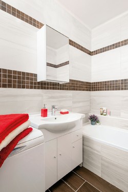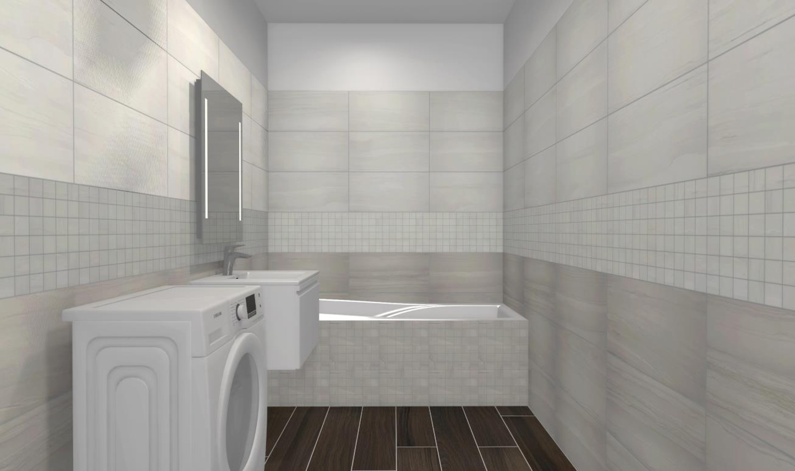 From that moment on, the apartment was very busy. Fortunately, a skilful brother-in-law of Mrs. Tomášová helped and finaly tiled the new bathroom. The 30 x 60 cm wall tiles from the Boa series, imitating marble, caught the attention of both the mother and the daughter at first sight. „We even liked the older series, we thought about the series Next, but in the end, we approved the Boa unanimously,“ Marie Tomášová describes. They used the visualization, the bathroom design from RAKO creativeshop. Just before the implementation, they decided to highlight the Boa tiling with the Board 5 x 5 cm mosaic with a wood-like design. Dividing the mosaic, that is glued onto a net, into two pieces created interesting horizontal listels. The Board mosaic matches the Board floor tiles 30 x 120 cm on the bathroom floor.