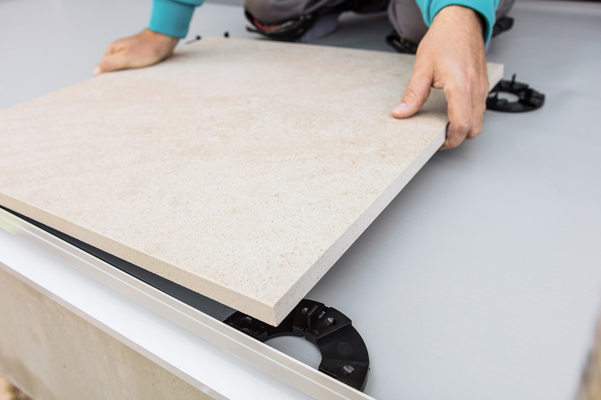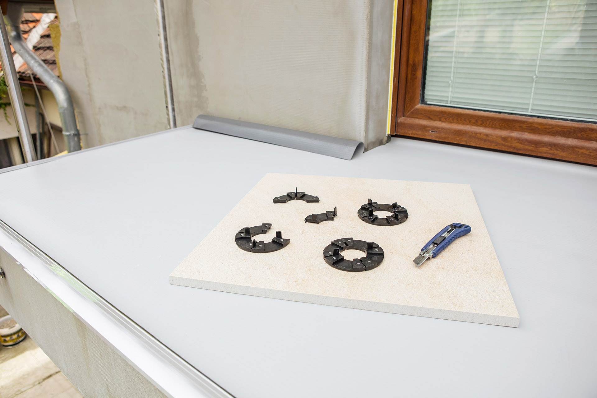 Prepare everything you need: Laying on pedestals is a method using supports (pedestals) and 2-cm tiles that withstand walking loads. As the base, we recommend using a waterproofing PVC sheet with a reinforcing grid, ≥1.5 mm thick. Underlay the PVC sheet with a geotextile to reduce the risk of the sheet being punctured by sharp tips on the concrete surface. The concrete slab should have a slope of 2% from the building. Entrust the sheet installation task to a professional because failure to follow the technological procedure may result in water leakage into the structure.