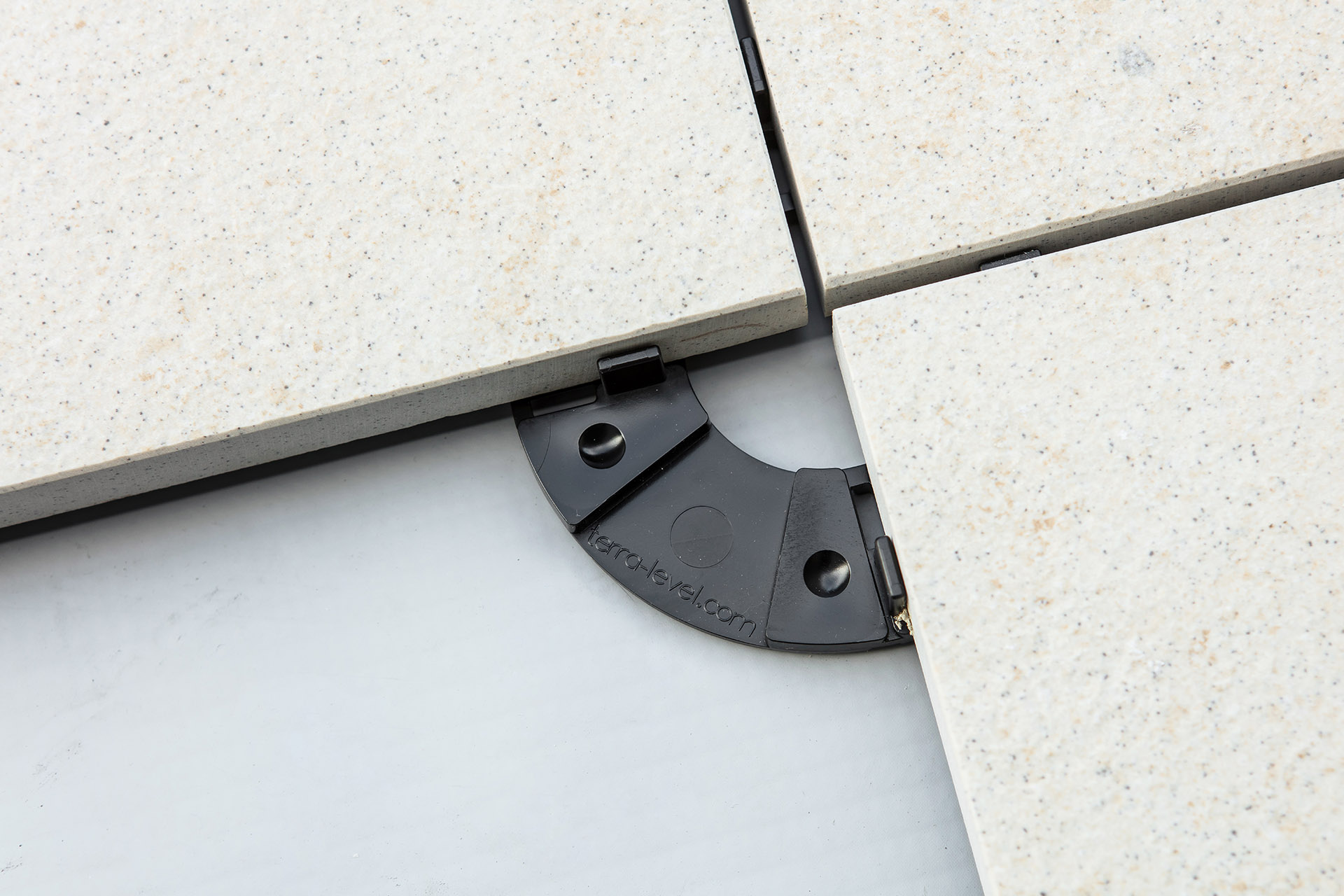 Laying on low fixed-height pedestals is a quick method with minimum maintenance requirements and trouble-free access to the base. The pedestal height cannot be adjusted by screwing, it is the same across the entire surface. Installing the floor is easy, the structure can be easily disassembled at any time. The pedestal spacers define exactly the joint, which is about 4 mm wide. This joint width is not disturbing, yet it ensures sufficient water outflow from the terrace.