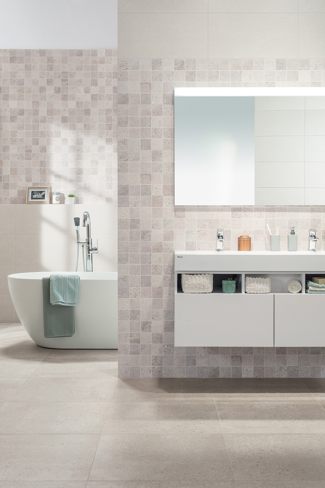 Dans l'esprit de l'imitation du terrazzo, la série Piazzetta a été créée dans des couleurs qui ne font que souligner l'aspect parfait des carreaux. Les carreaux rectifiés et les carreaux frittés non émaillés au design de béton à gros grains, le ciment trouvent leur place dans les espaces privés et les bâtiments publics. La diversité des solutions pour la salle de bains est assurée par la mosaïque, déclinée en trois décors. Le décor de 30 x 60 cm, qui consiste en un mélange de fausses mosaïques à un prix avantageux au m², ainsi que les mosaïques coupées de 10 x 10 et 5 x 5 cm collées sur une grille pour la décoration des murs et des sols ou comme aide pratique pour s'attaquer aux zones difficiles à revêtir. Les carreaux de base peuvent être combinés avec les carreaux décorés rectifiés Betonico 30 x 60 cm.
